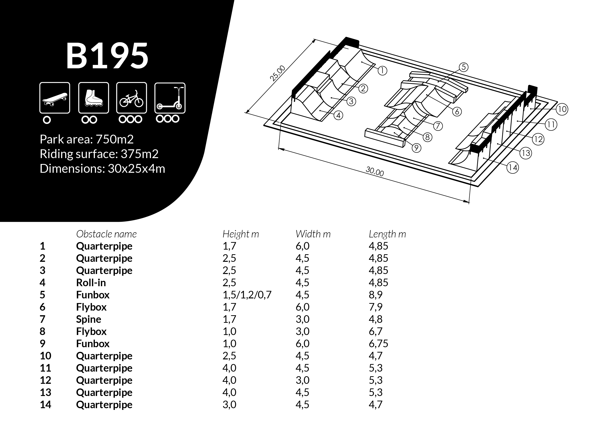 Skateboard Sofia är utformad som skateparklösning för skateparker och offentliga aktivitetsytor. Mått: L 25 m, B 30 m, H 4 m.