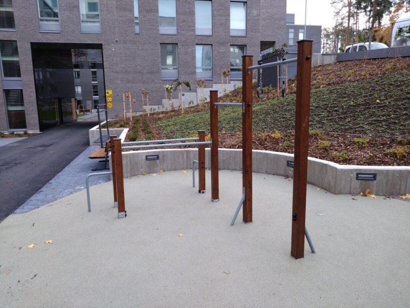 Kompakt träningskomplex för utomhusbruk bestående av parallella stänger samt en dubbel hängstång utrustad med hängande ringar och stretchelement. Anpassat för funktionell träning i offentlig miljö.