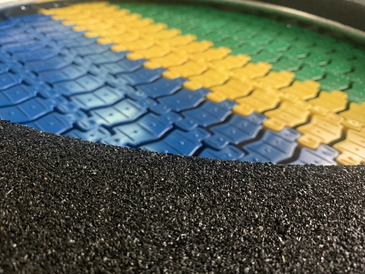 jumping mat is Gjord av very hållbart V-shaped polyamide elements (lamellas), med en non-halk yta in formalternating horizontal och round protrusions,