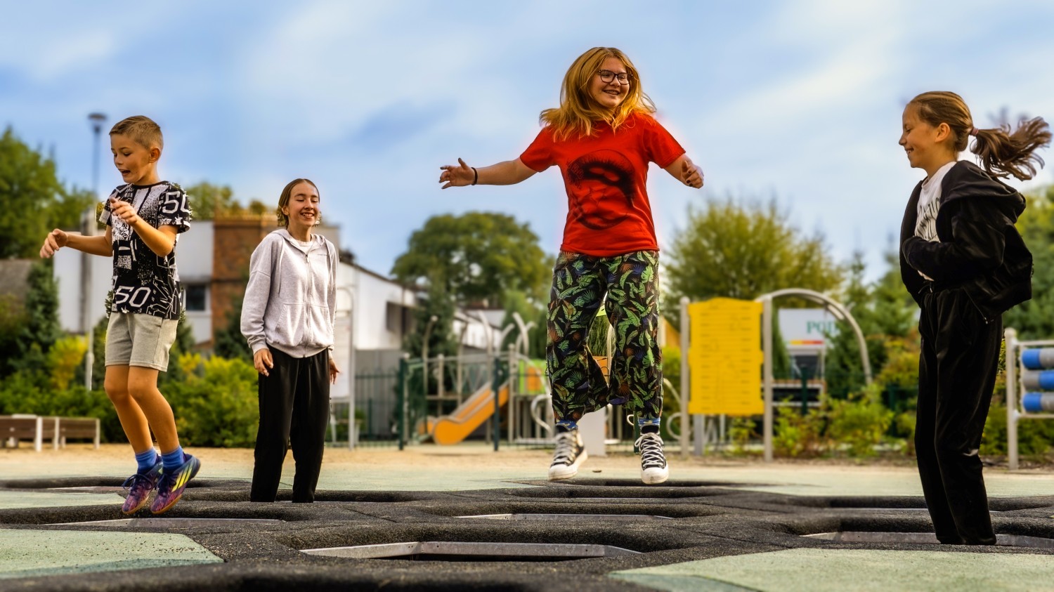 Studsmatta Trampolin FÖRSTA HJÄLPEN KIT för intensiv offentlig lek med säker studs, hållbar konstruktion och hög användarkomfort över tid.