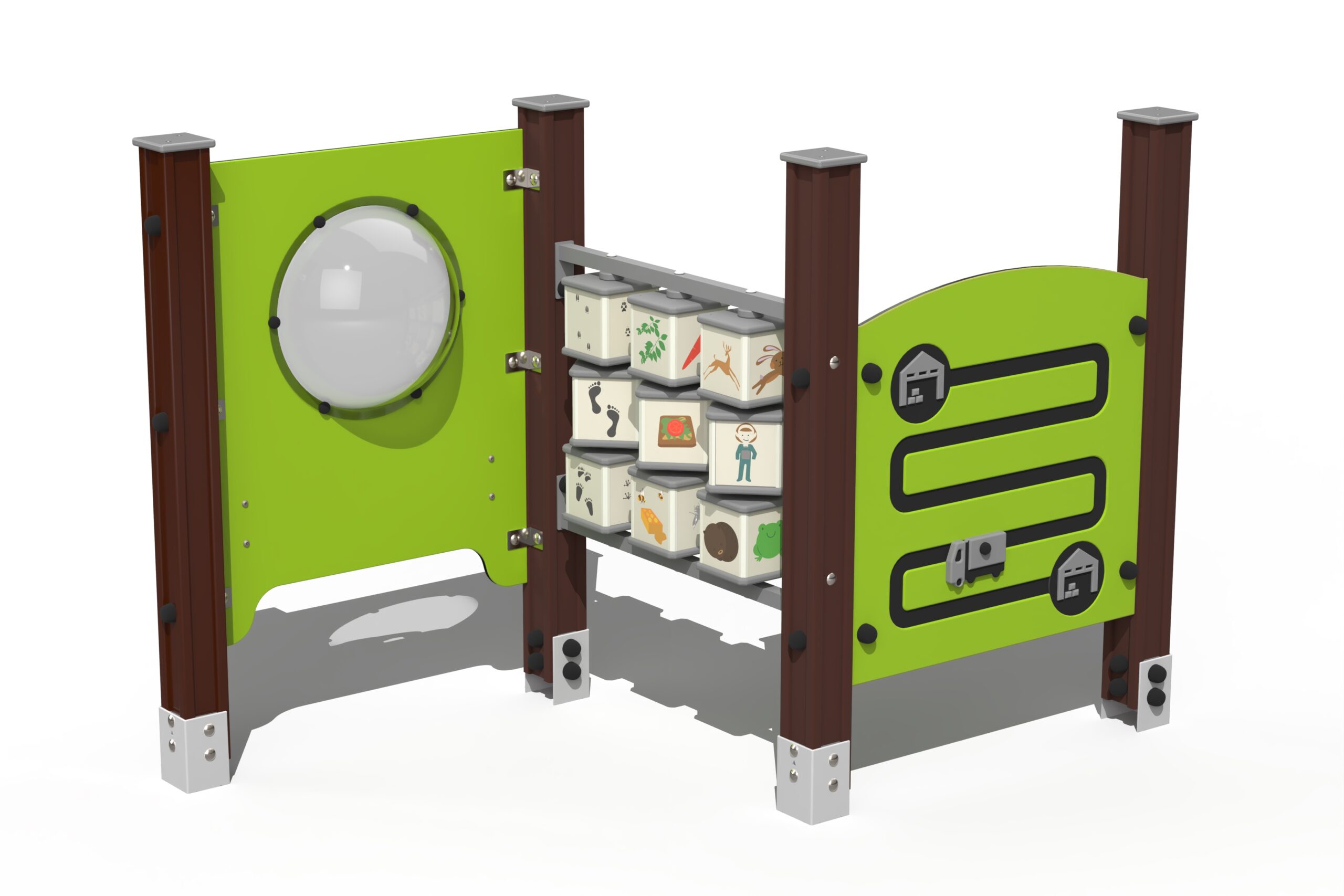 Cockpit-väggen innehåller rörliga spakar och roterande hjul som låter barn känna sig som piloter, bilförare eller lokförare. Animals-väggen hjälper barn att identifiera 12 olika djur, deras spår och föredragna föda genom matchning av bilder på roterande kuber.