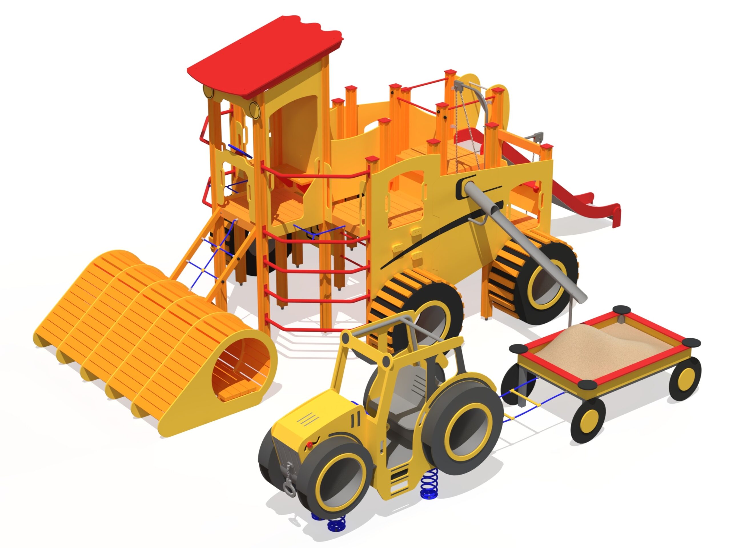Produkten är en del av FARMLIFE-serien och är utvecklad för lekplatser, förskolegårdar och andra offentliga utemiljöer. Modellen är ett temalekset med maskin- och gårdskaraktär där barn kan skapa berättelser, samverka och röra sig mellan olika delar. Kombinationen av traktor och släp förstärker rollekar och gör produkten till en tydlig samlingspunkt i farmtematiska lekytor. Konstruktionen är anpassad för regelbunden användning i offentlig drift med fokus på lång livslängd och trygg användning. Mått enligt specifikation: cirka 7,74 x 5,93 m. Rekommenderad ålder: 1+. En hållbar lösning för aktiv och fantasifull lek i farmtematiska miljöer.