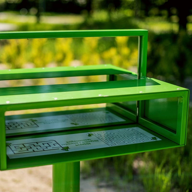 Spegelskrift är en dubbelsidig interaktiv enhet där användaren ställer sig framför en spegel och utför uppgifter genom att enbart titta på spegelbilden. Barn och vuxna kan prova att gå igenom en labyrint eller skriva sitt namn med händerna placerade i hyllan, vilket skapar en oväntad och rolig utmaning.