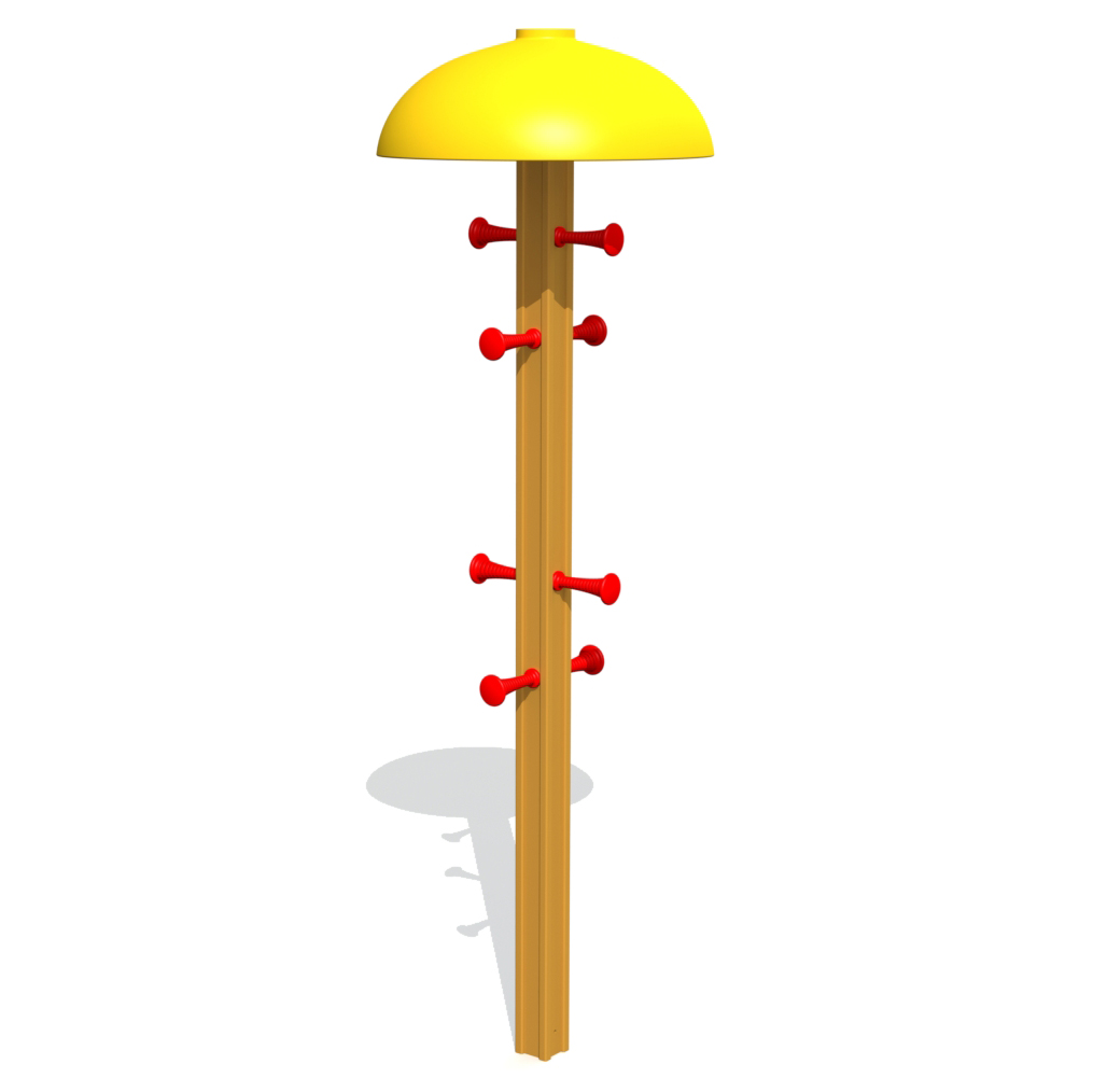 Litet svampformat stativ med plastpinnar i olika höjder för upphängning av kläder och väskor. Pinnarna har förstärkta kärnor och stativet är ingjutet i marken för stabilitet.