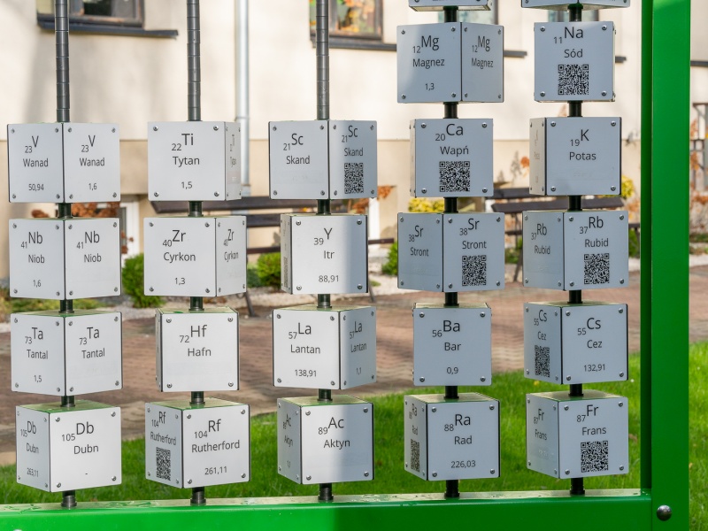 Ett praktiskt pedagogiskt verktyg som tar kemiundervisningen utomhus. Varje roterande kub representerar ett kemiskt grundämne och visar dess symbol, atomnummer, atomvikt och elektronegativitet, vilket gör abstrakta begrepp konkreta och begripliga.