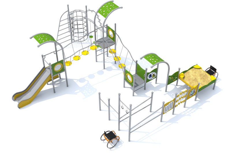 Tillgänglig lek DOMO-I 2-4 för inkluderande lekmiljö där fler barn kan delta på lika villkor med fokus på säker och hållbar användning. Material: rostfritt stål och HPL.