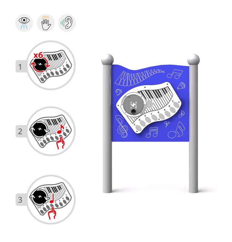 Tillgänglig lek Elektronisk musiktavla SONO 1A för inkluderande lekmiljö där fler barn kan delta på lika villkor med fokus på säker och hållbar användning. Material: rostfritt stål och pulverlackerat stål.