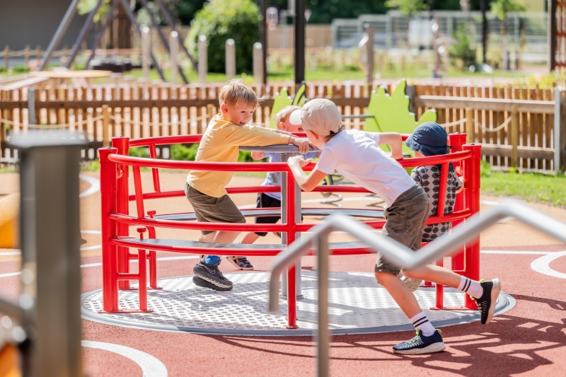 Rullstolskarusell där rotation endast är möjlig när samtliga grindar är stängda. Grindarna fungerar både som skydd och lås för säker användning. Utformad för trygg och inkluderande lek för rullstolsburna barn.