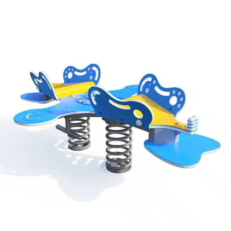 Fyrsitsig gungbräda monterad på fjädrar, särskilt utformad för inkluderande lek. Två säten är anpassade för liggande position och två för sittande. Barnen möts i mitten, vilket uppmuntrar samspel och gemensam lek. Tillverkad i rostfritt stål (ram och fjädrar), HDPE-plast (säten), PE-plast (handtag) samt förstärkt glasfiber för specialsäten.