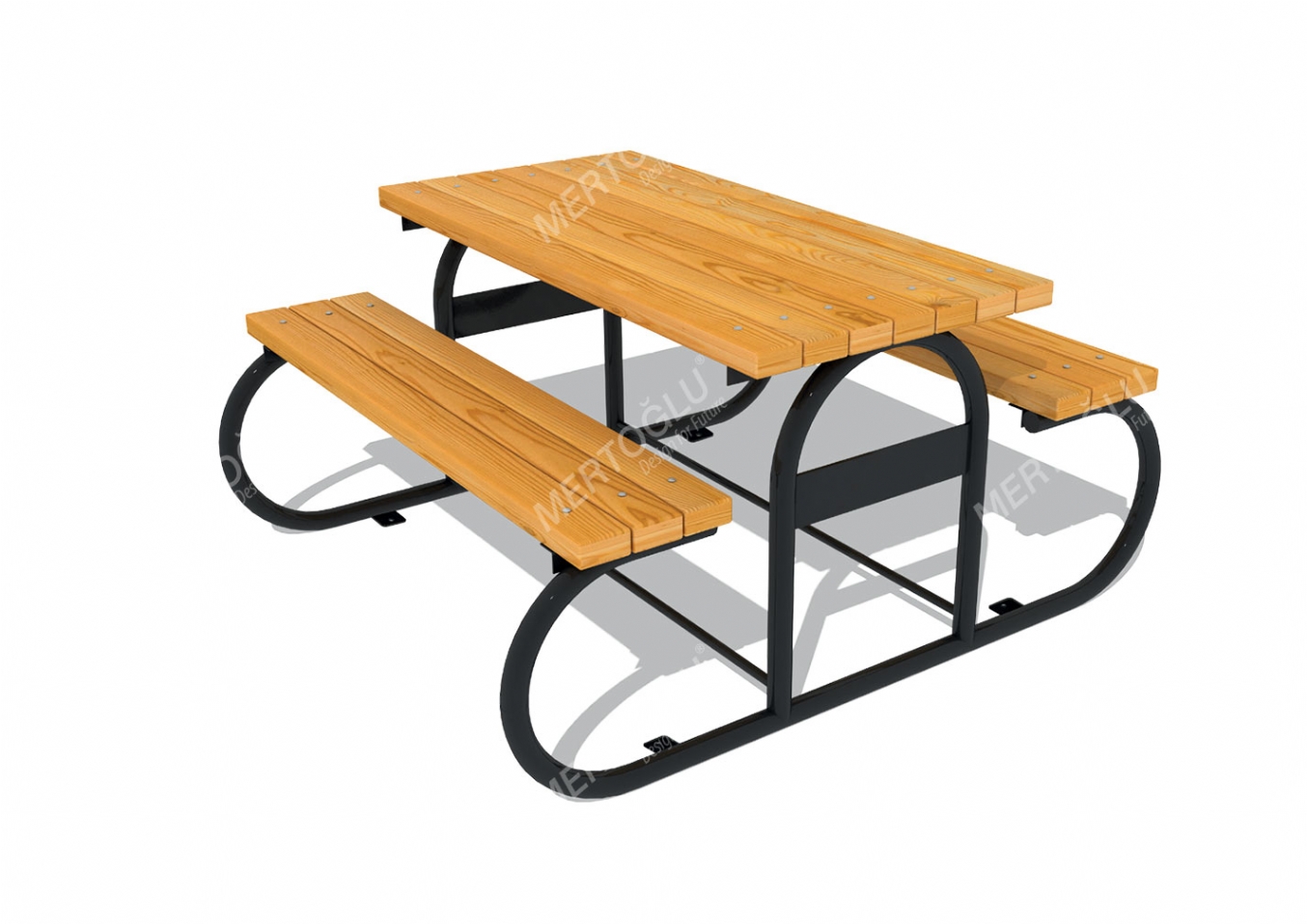 Utemöbel Wile i plåt och impregnerad furu för offentlig miljö.