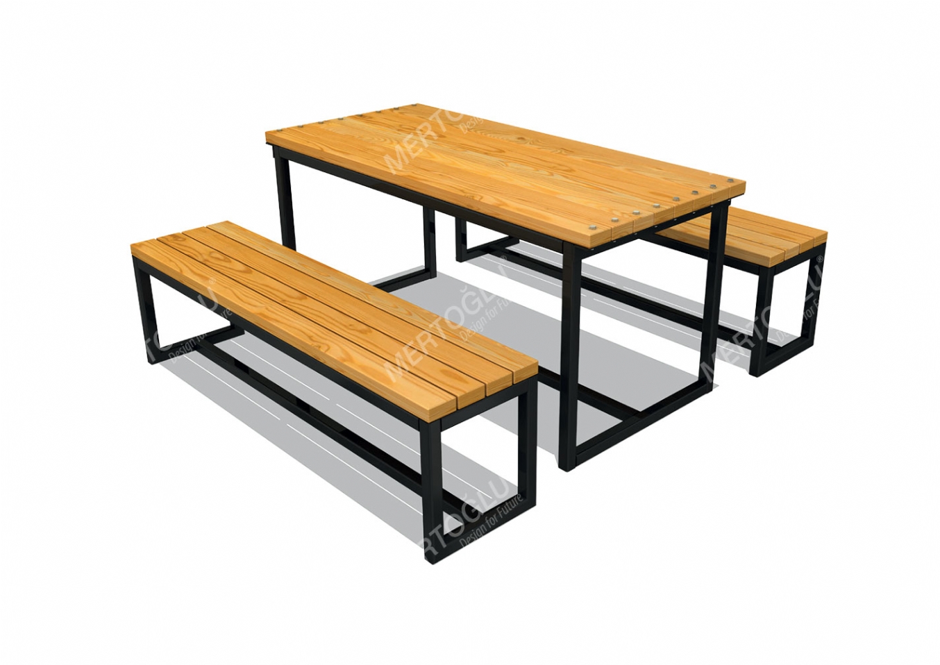 Utemöbel Wilia i laser cut och impregnerad furu för offentlig miljö.