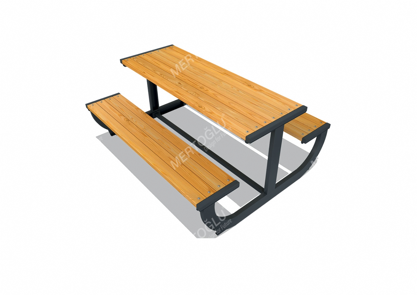 Utemöbel Wilil i plåt, metallprofil och impregnerad furu för offentlig miljö.