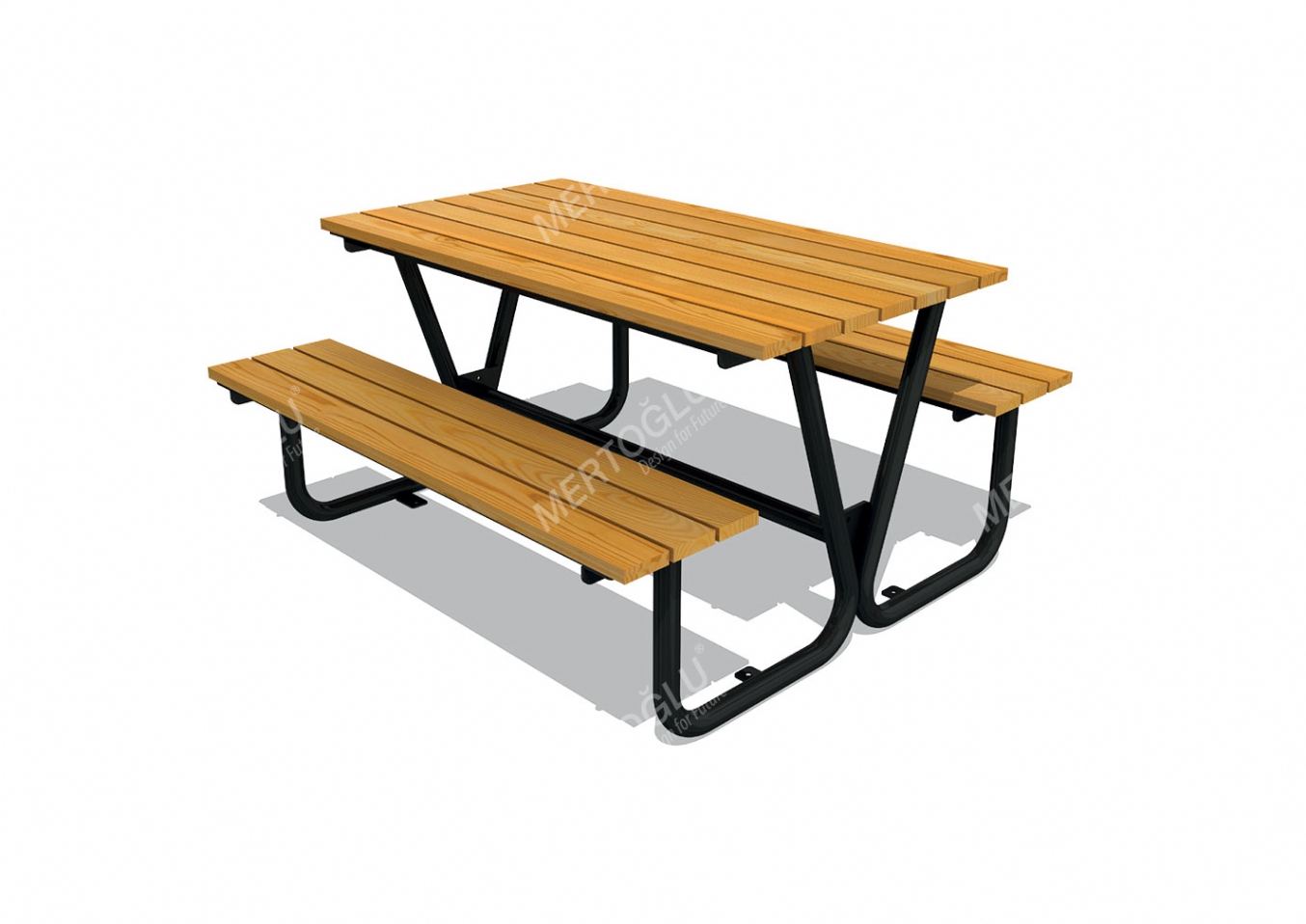 Utemöbel Wilin i plåt, tube profile och impregnerad furu för offentlig miljö.