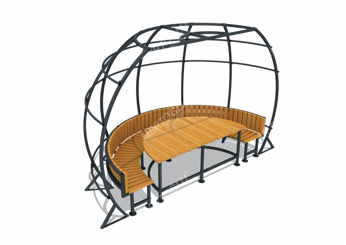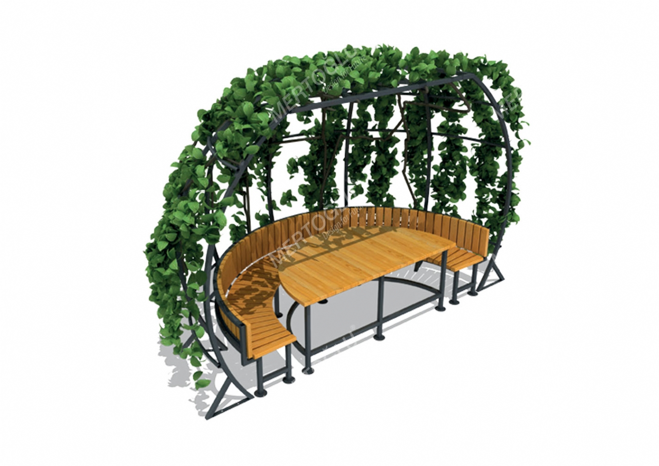 Utemöbel Wilira i plåt och impregnerad furu för offentlig miljö.