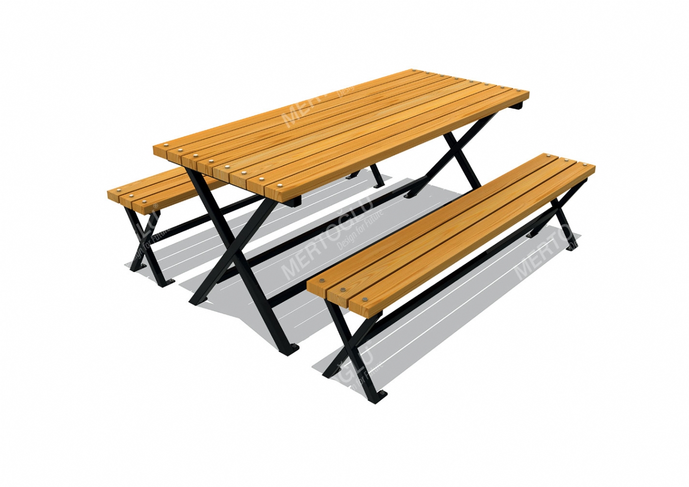 Utemöbel Wilis i plåt och impregnerad furu för offentlig miljö.