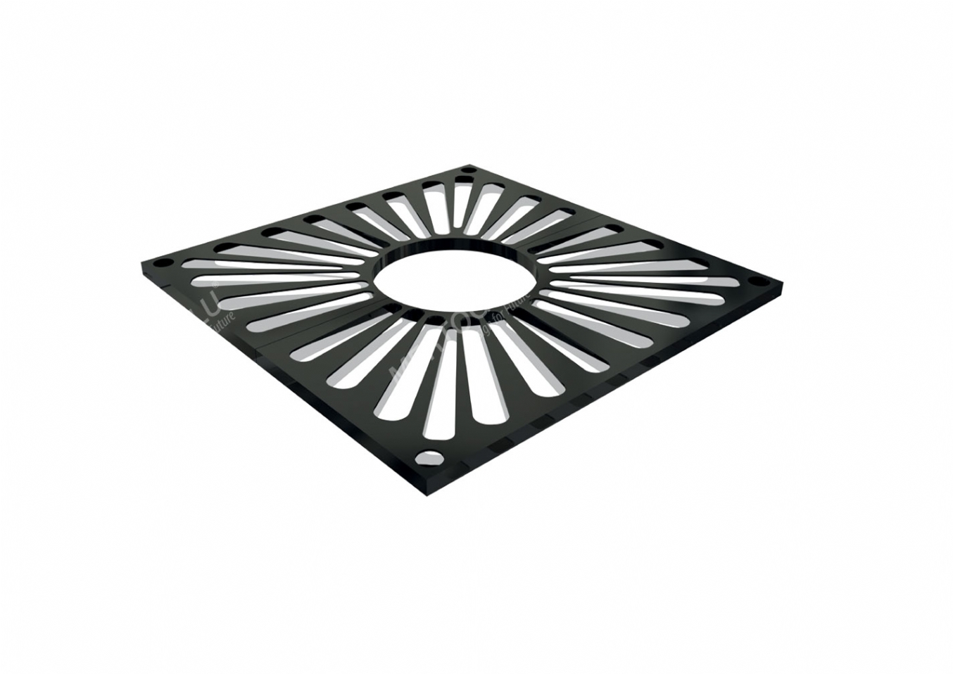 Utemöbel Zeno i plåt och laser cut för offentlig miljö.