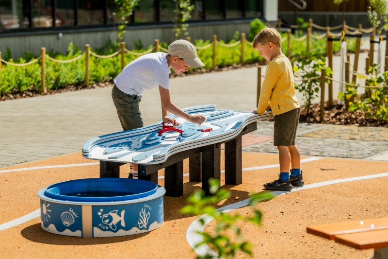 Vattenspel som låter barn experimentera med vattenflöden, dammar och broar. Uppmuntrar utforskande lek och förståelse för vattenrörelse.