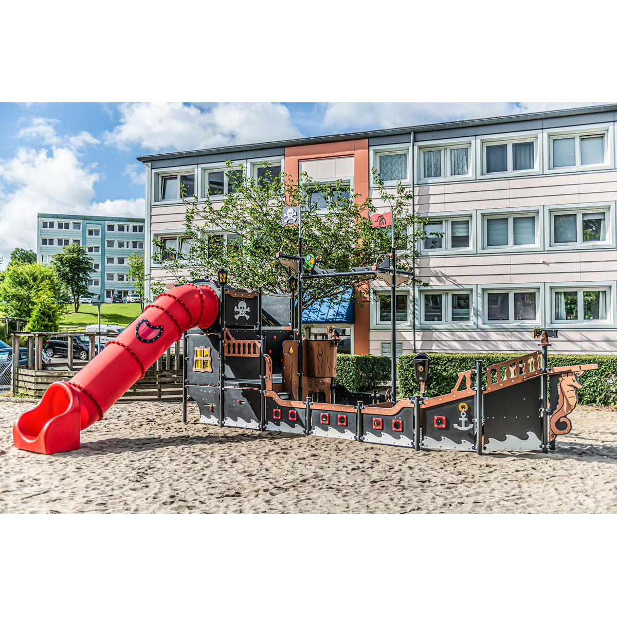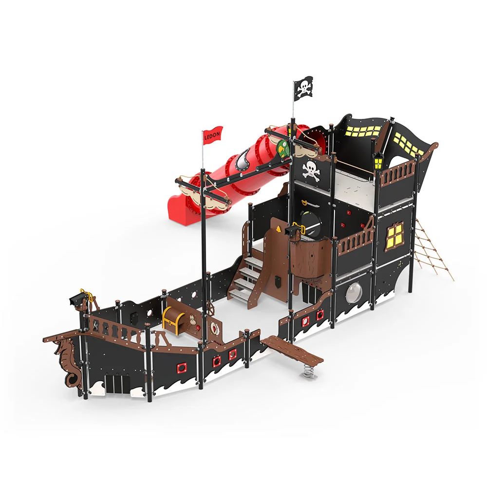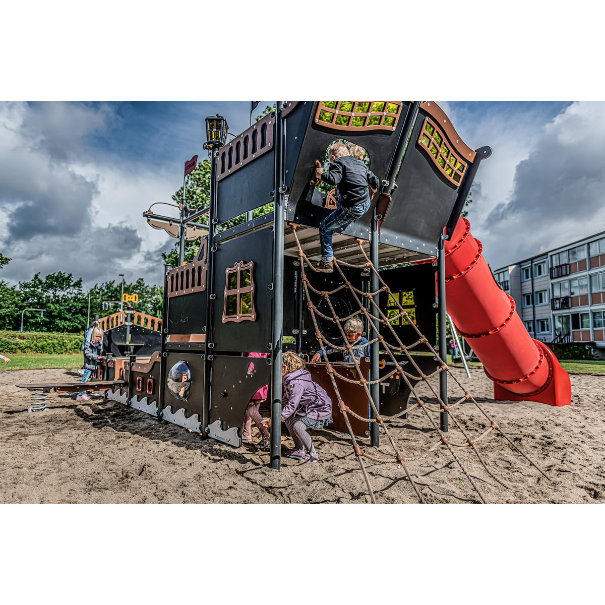 Jättepiratskepp med populär rörrutschbana som erbjuder maximal lekvariation, höjdskillnader och fartfylld piratlek för stora lekplatser.