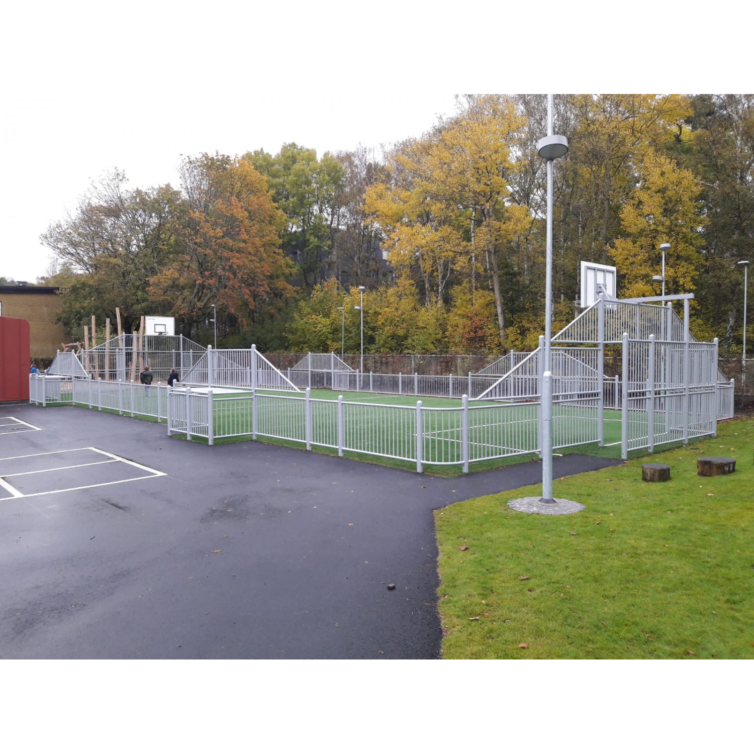 Sports Arena (Muga System), bestående av två fotbollsMål, två innebandyMål och två korgar. Moduler att bädda in i marken. Fotobilden visar exempel på produkter som ofta modifieras för att möta kraven för ett visst projekt
