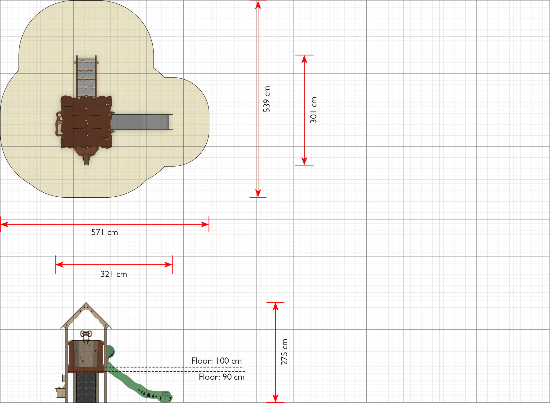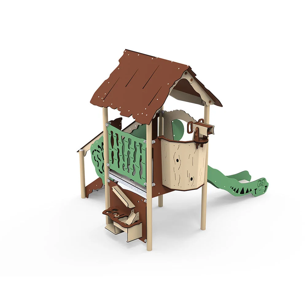 Mångsidig lekställning med torn, rutschkana och rolleksfunktioner. Passar en bred åldersgrupp.