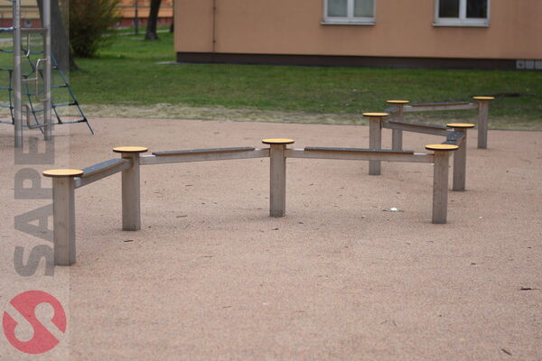 Balansbana 16271 har en bas i rostfritt stål med åtta stöd och gångyta av HDPE-skivor. Fallhöjd upp till 1 meter gör att gräsyta är tillräcklig. Konstruktionen är underhållsfri och lämpad för lekplatser, skolor, parker och offentliga miljöer. Uppfyller EN 1176-1.