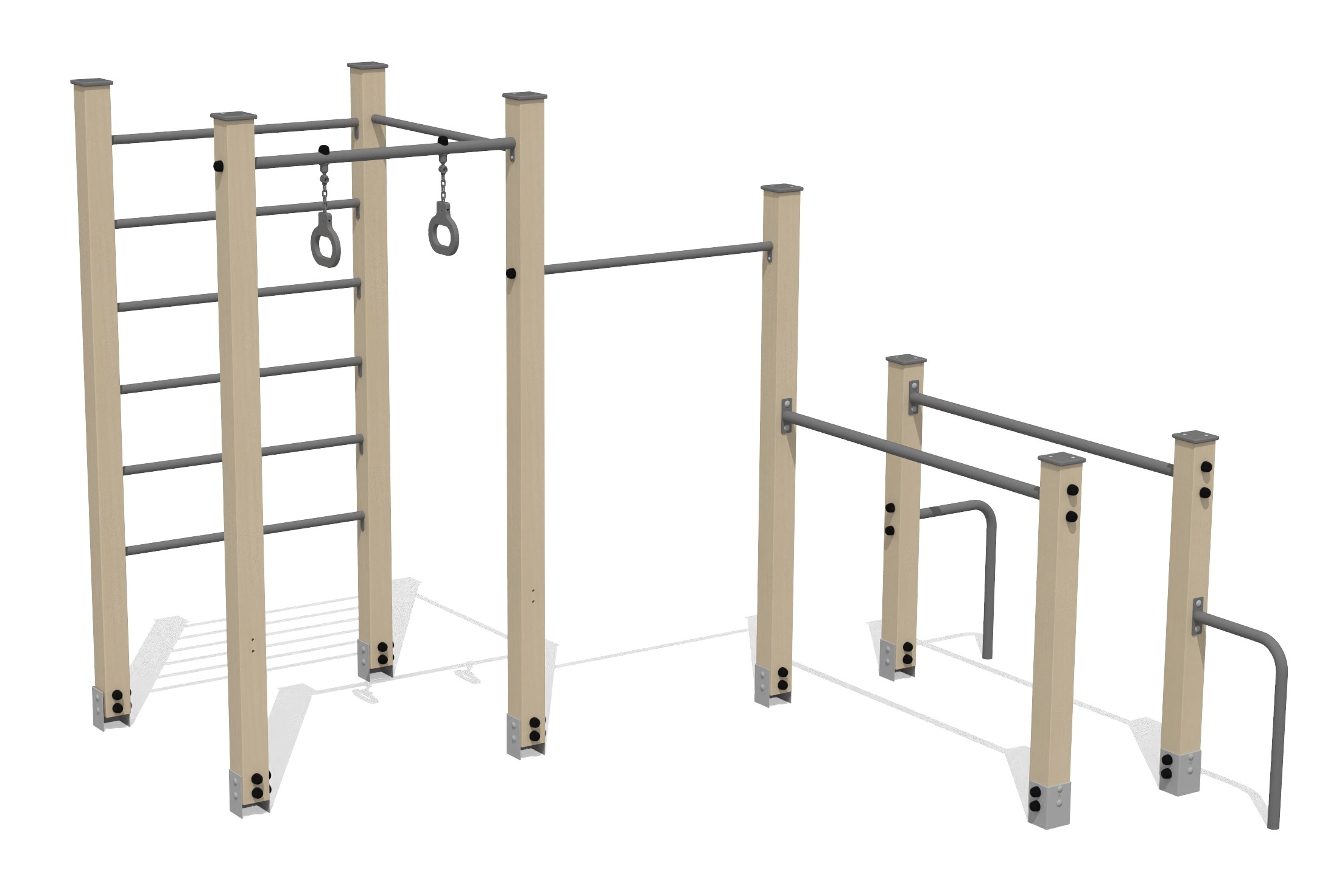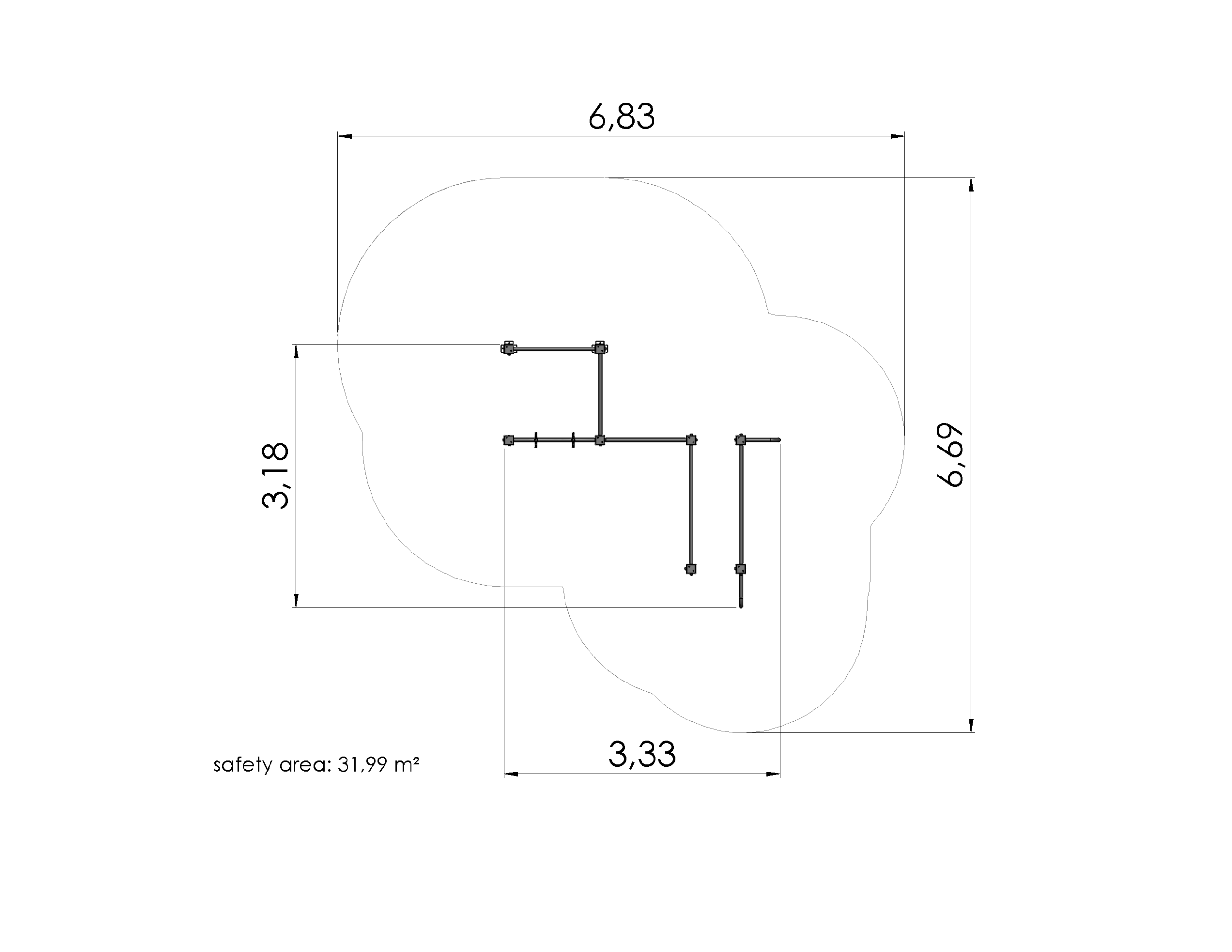 Produkten är utvecklad för lekplatser, förskolegårdar och andra offentliga utemiljöer där utrustningen behöver tåla regelbunden användning över tid. Modellen uppmuntrar barn att träna kroppskontroll, koordination och självförtroende genom aktiv rörelse. Mått enligt specifikation: cirka 3,33 x 3,18 x 2,37 m. Rekommenderad ålder: 4+. En hållbar lösning för långsiktig drift och trygg användning i offentlig utemiljö.