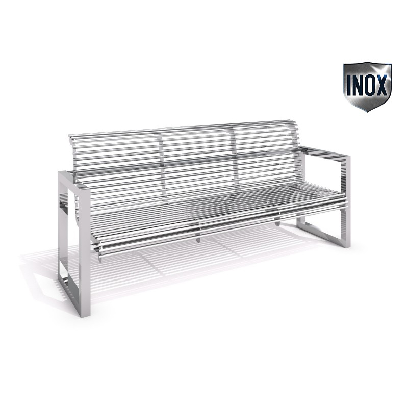 Rostfri bänk med ryggstöd och armstöd. Sits och rygg i rostfritt stål. Modern och enkel urban stil.