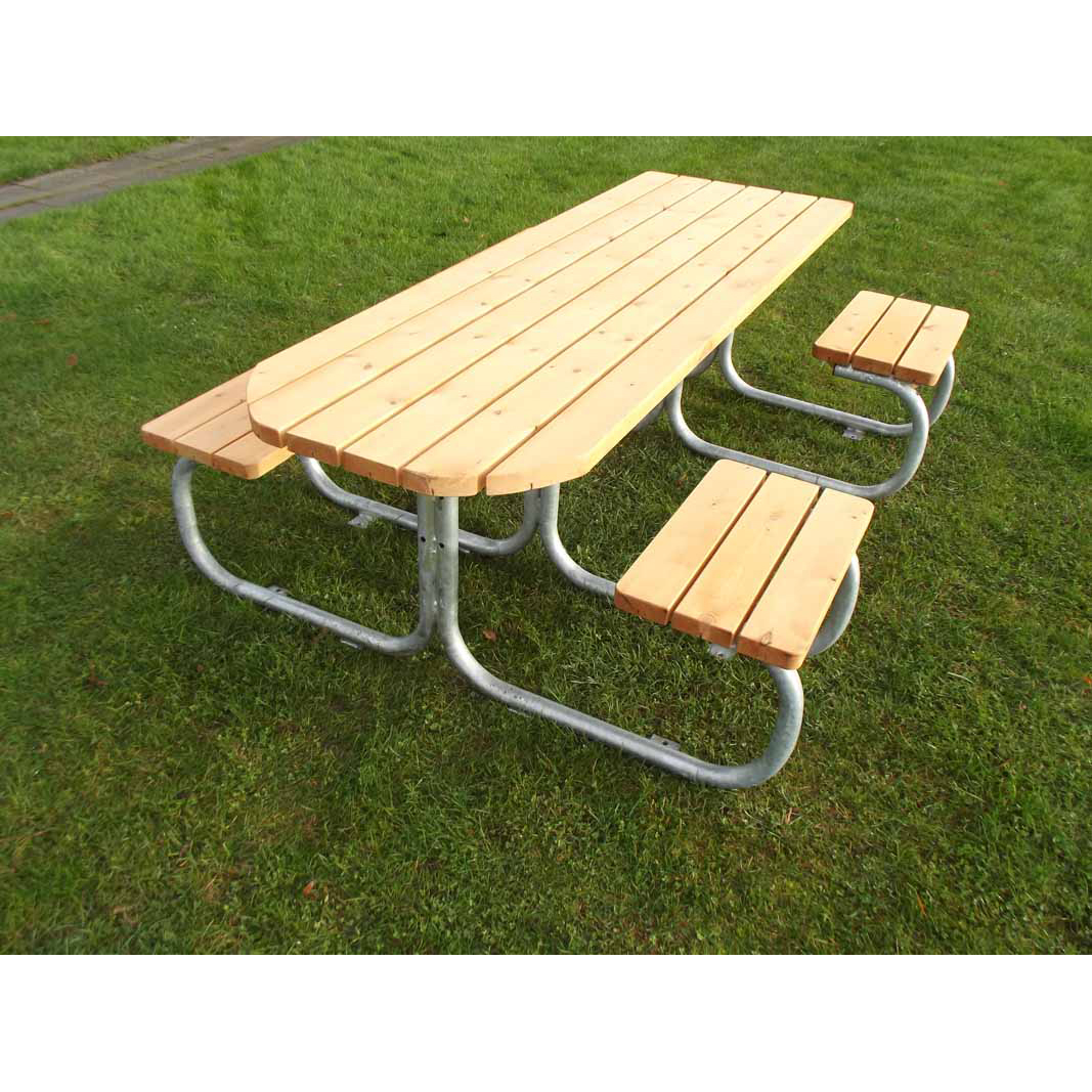 Bänkset i svensk norrländsk furu/ varmgalvaniserat stål Ø50 mm. 3 mm. tjocklek. til 6 pers. + 2 rullstolsanvändare max mål B: 80 H: 71 cm. Total L: 240 B: 160 cm. Bord L: 240 cm. Bänk L: 60/200 cm. furuplankor 40 X 115mm. Vikt 130 kg. Är förberedd för fast montering på marken. 3 plankor i Sittplats, 6 plankor i bordsskiva Sittplats, bordsskiva levereras färdigmonterade med avrundade hörn. Monteringstid ca. 35 min. Sittplatshöjd: 47 cm. Bord höjd: 75 cm. Upp till 4 set per pall. Pallmått. 240 X 80 cm.