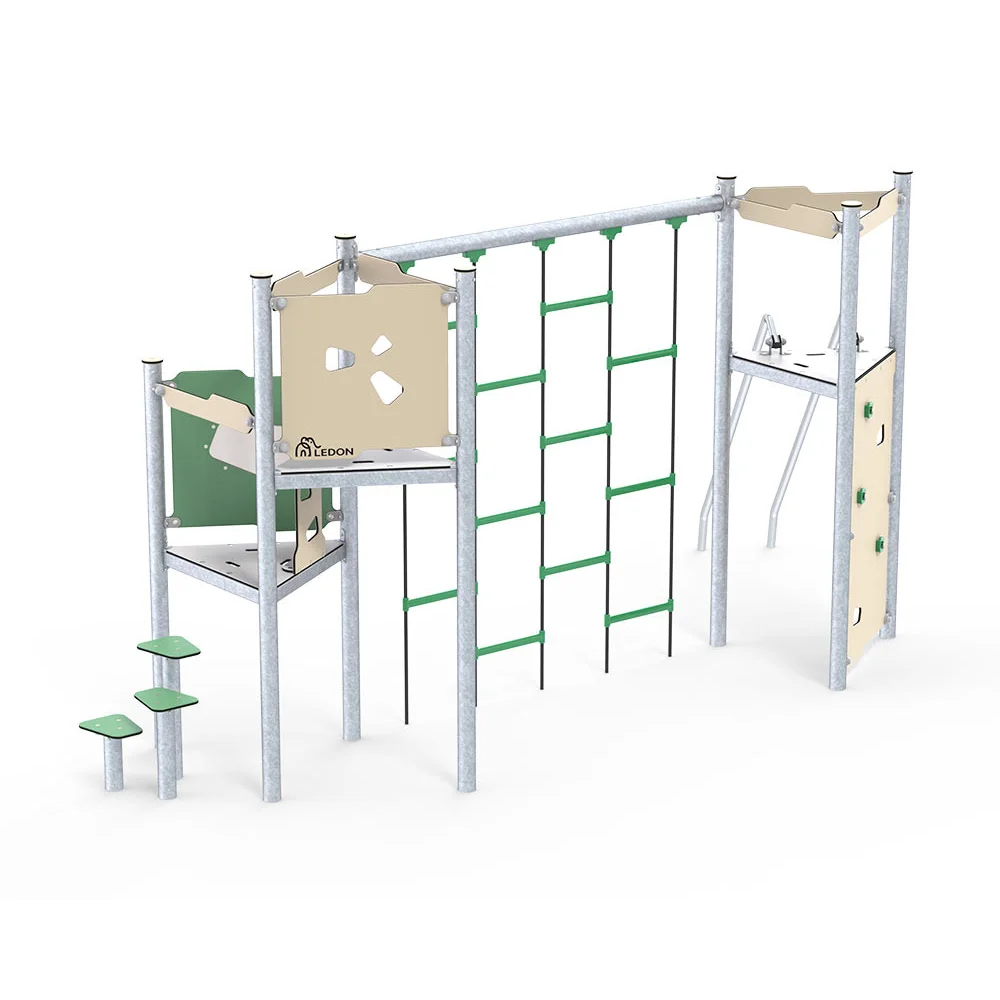 Kompakt tvåtornsmodell med klätternät, glidstavar och trampstenar som tränar balans och grovmotorik.