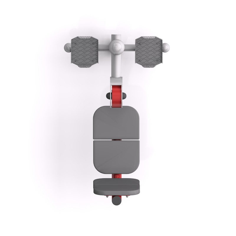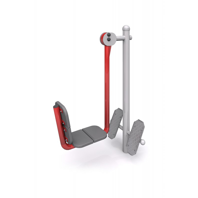 Sittande benpress i utegym för träning av lår- och sätesmuskulatur. Ökar styrka, rörlighet och uthållighet. Säte och ryggstöd är klädda med polyuretanskum för bekväm användning året runt.