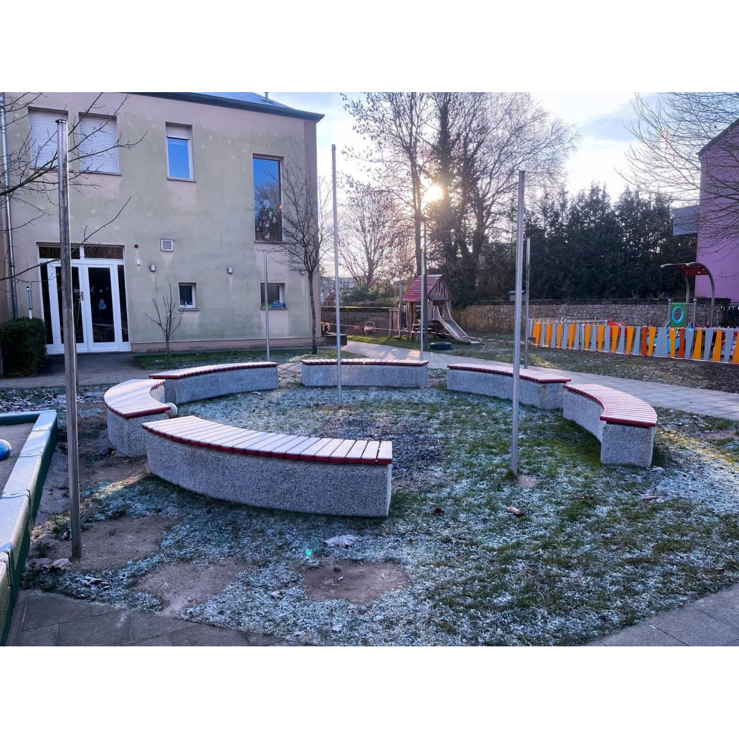 constructiona bench Gjord av concrete med grit aggregate. seat Gjord av spruce trä.