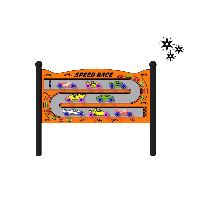 Stor sensorisk tavla designad för kreativ lek, anpassad för användning av barn i rullstol. Huvudtemat är bilar på en racerbana. De roterande hjulen fungerar som bilhjul och avger färgstarkt ljus när de sätts i rörelse, vilket gör spelupplevelsen mer engagerande. Överst på tavlan finns inskriptionen ”SPEED”. Racerbanan är omgiven av räfflor som imiterar växtlighet. Strukturen är gjord av svart stål, pulverlackerad för hållbarhet. Själva skivan är gjord av HDPE-plast. Rören är avslutade med dekorativa sfäriska element. * Tillgängliga stolpar färger [RAL]: 7016; 9006.