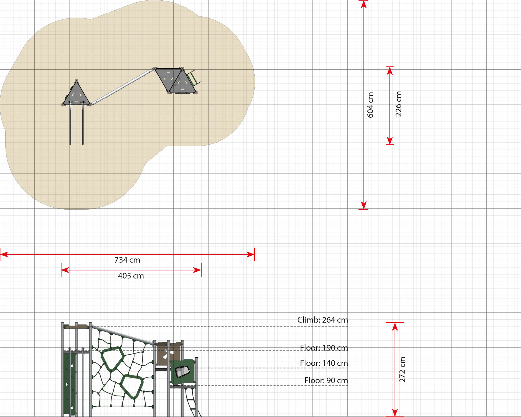 Billie är en tvåtornsmodell med golvhöjder på 140 cm och 190 cm samt klättervägg, klätternät och skjutstavar. Konstruktionen är anpassad för äldre barn och tränar grovmotorik, balans och självförtroende. Klätternätet är tillverkat av Taifun-rep med 48 ståltrådar som ger mycket hög draghållfasthet och motståndskraft mot vandalism. Lekmiljön stödjer både fysisk och social utveckling.