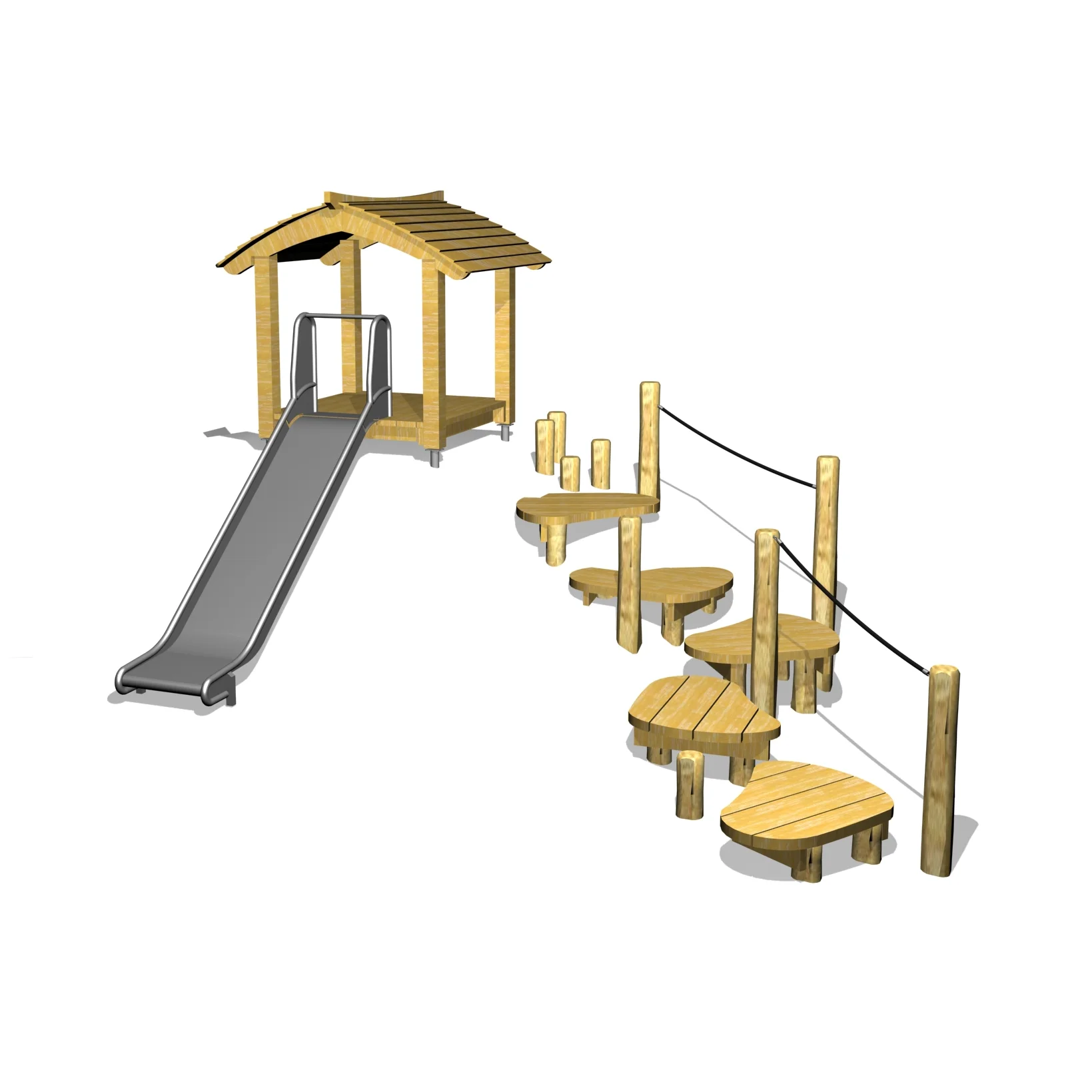 Rutschkana med entré, avsats med tak, trappor och rep, anpassad för placering i kulle. Skapar en sammanhängande lekstruktur som utnyttjar höjdskillnader i terrängen.