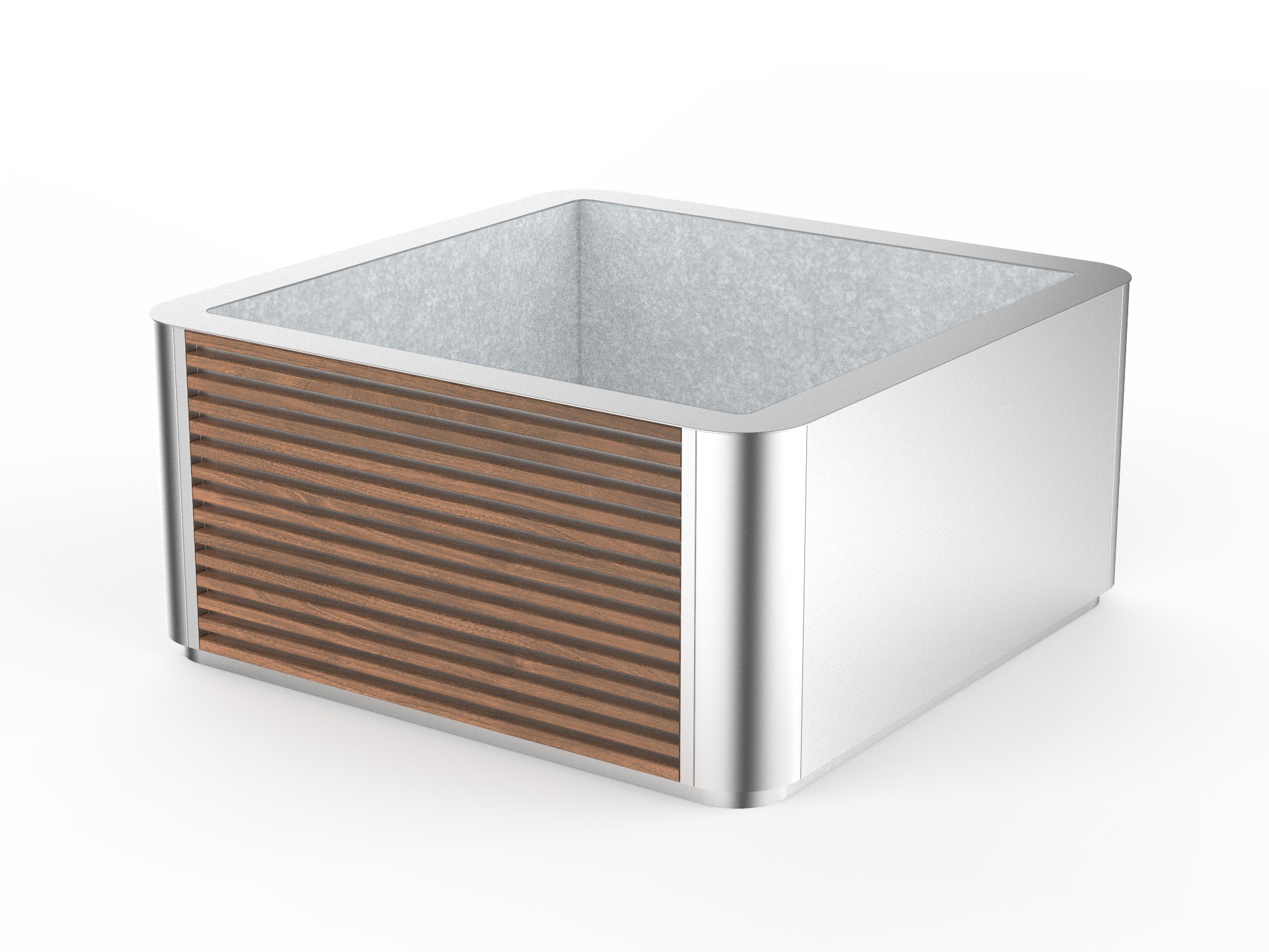 Stor blomlåda med dräneringssystem och kranlyftsfunktion, i galvaniserat stål och trädetaljer.