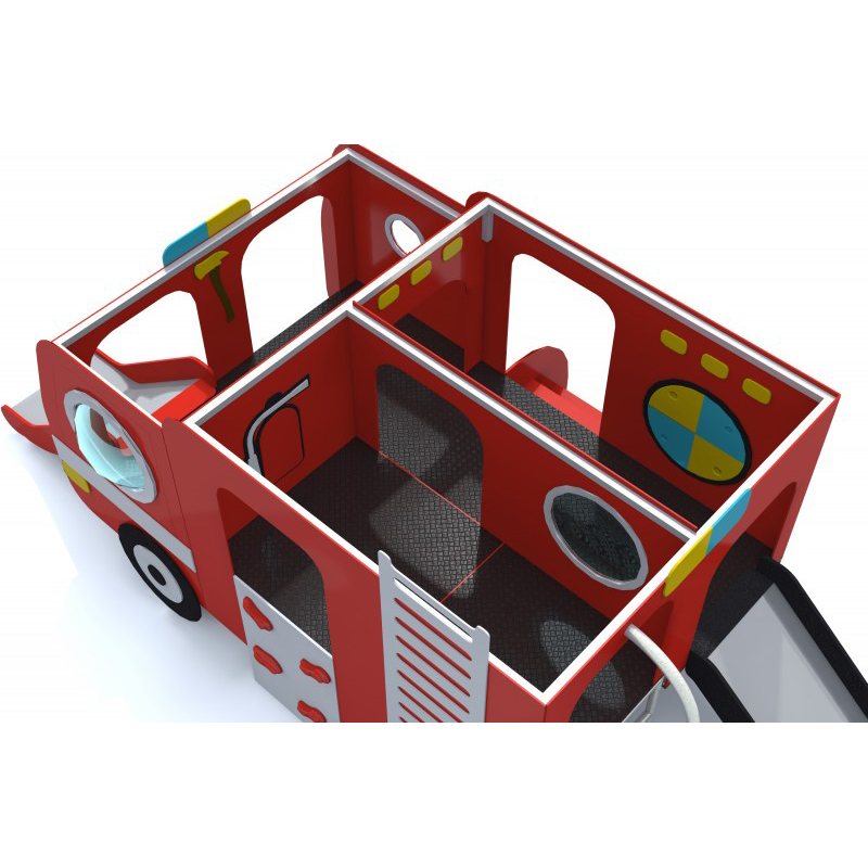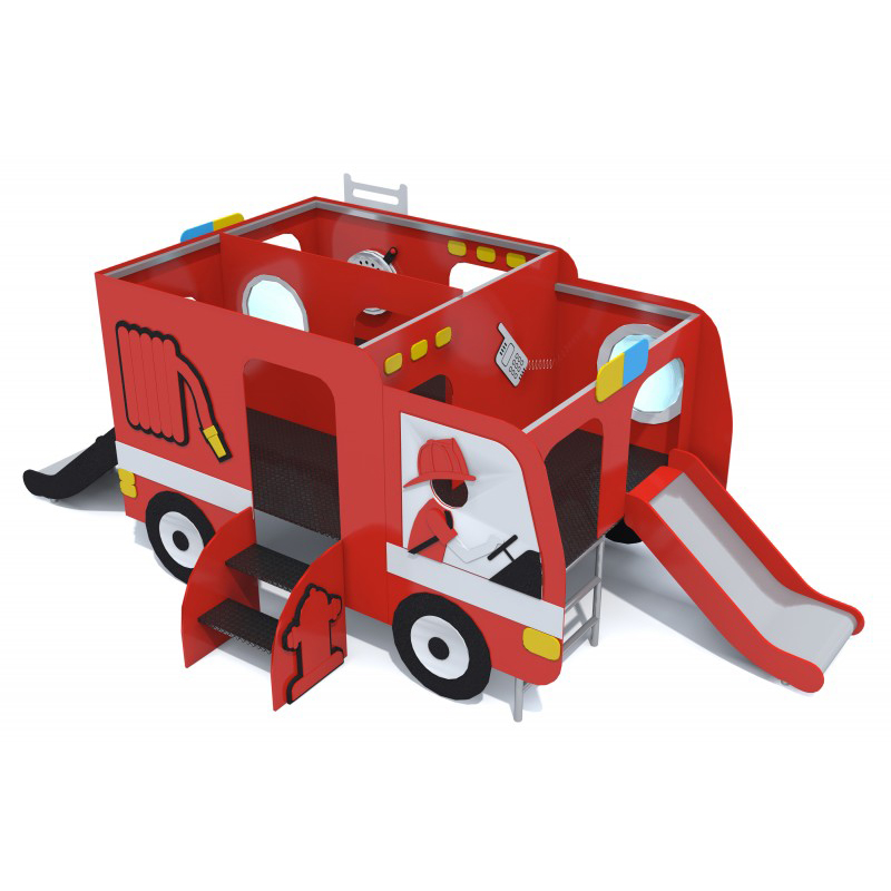 Lekplats med rutschbanor formgiven som en brandbil. Stommen är tillverkad av stål och anpassad för intensiv användning. De strukturella väggarna är gjorda av HPL-skiva och dekordetaljer av HDPE. Golvet består av halksäker HPL-plåt som ger stabilitet under lek.