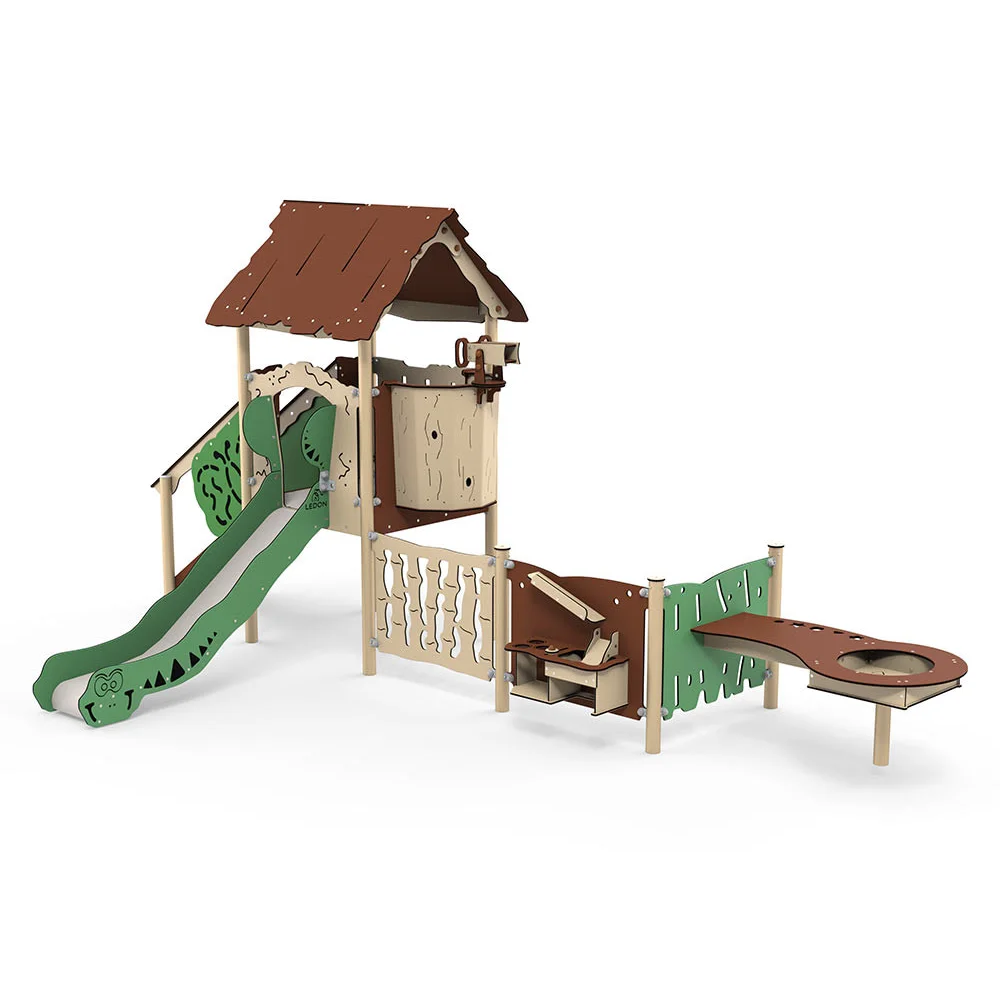 Caja är en lekställning som påminner om Atox men med ett lekstängsel som skapar en tydlig och trygg lekyta. Runt lekgården finns kök och plaskbord som inspirerar till rollekar där barn tränar samarbete, kommunikation och konflikthantering. Hela Explore-serien är byggd i material som kräver mycket lite underhåll och står emot väder och vind över tid.
