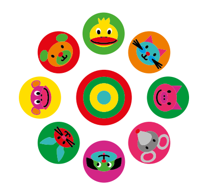 Markmålning med djurmotiv placerade i cirkelform. Utformad för att skapa lekfulla stationer som kan användas för rörelselekar, samlingar eller pedagogiska övningar.