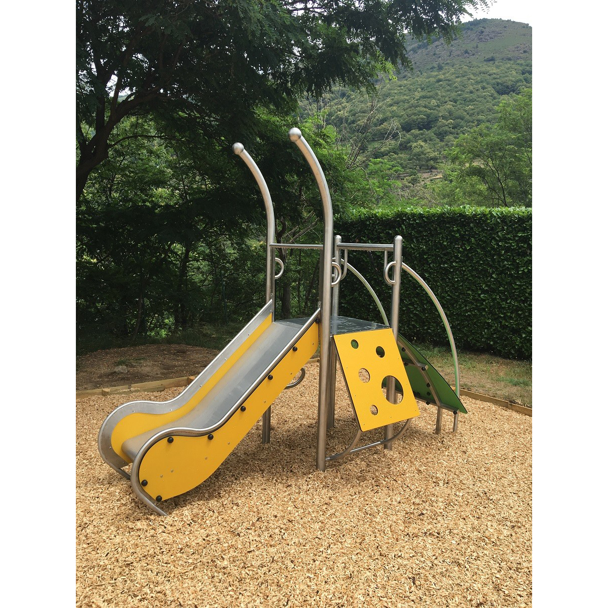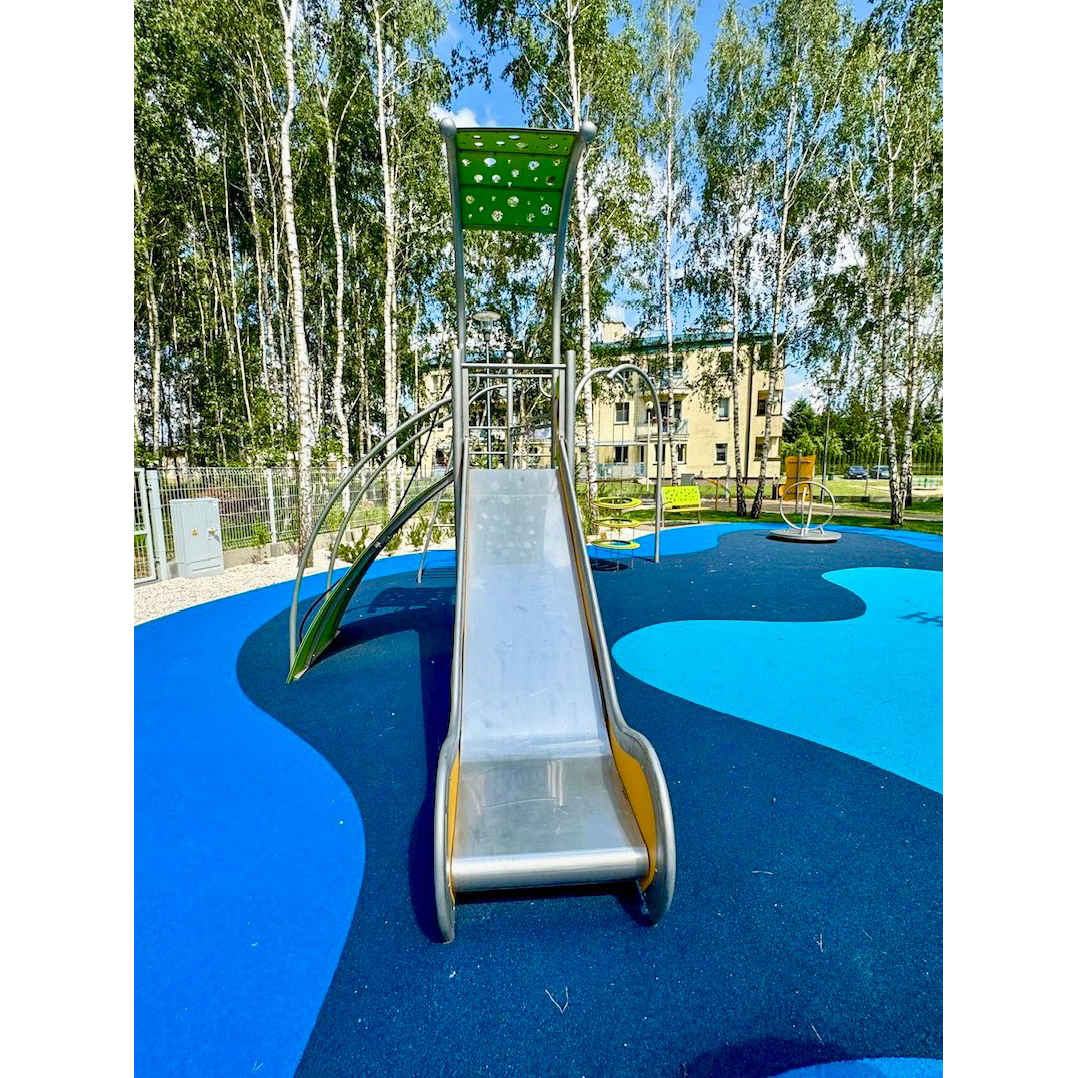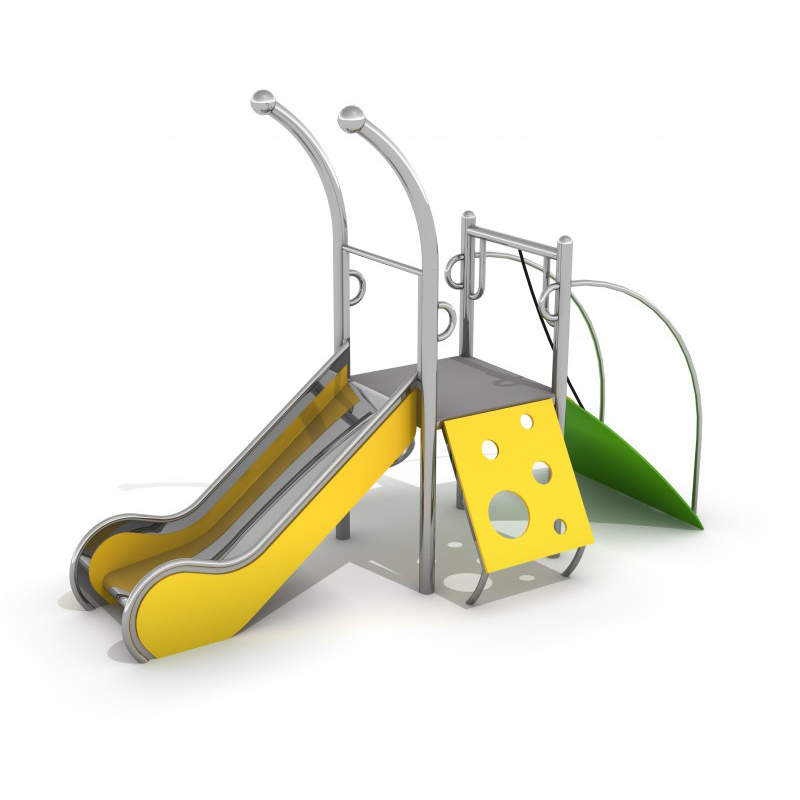Färgglada lekredskap med rutschkana, inspirerade av snigelns form. Konstruktionen är svetsad i högkvalitativt rostfritt stål och helt utan klämmor, vilket ger mycket god hållbarhet och väderbeständighet. Stolparna avslutas med sfäriska dekorativa element som påminner om snigelhorn. Väggar på rutschkanan, tornet och balustraderna är tillverkade av HDPE-skiva. Golvet består av HPL-panel med halkskyddsstruktur som ger säker användning, minimerar uppvärmning i solen och reducerar halkrisk vintertid. Uppfyller EN 1176. Avsedd för små barn. Produkten finns även i galvaniserad och pulverlackerad version.