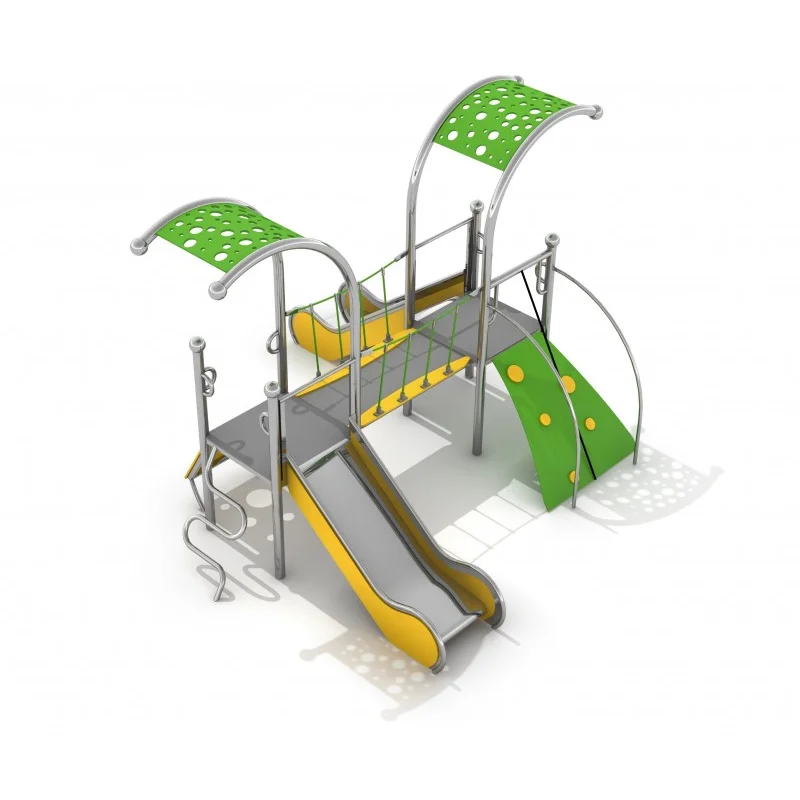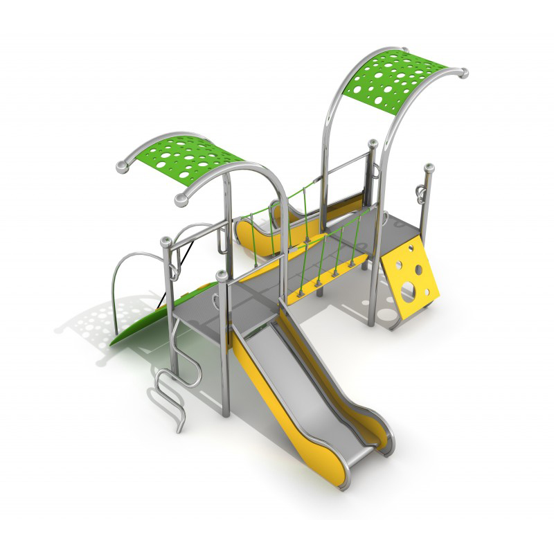 Färgglad lekutrustning med två torn, två rutschkanor, bro och genombrutet tak. Konstruktionen är svetsad i rostfritt stål utan klämmor och är mycket väderbeständig. Stolparna avslutas med sfäriska dekorativa element. Väggar, torn och balustrader är tillverkade av HDPE-skiva. Golvet består av halkskyddad HPL-panel som ger trygg användning året runt. Lekställningen uppfyller EN 1176 och är avsedd för små barn. Produkten finns även i galvaniserad och pulverlackerad version.