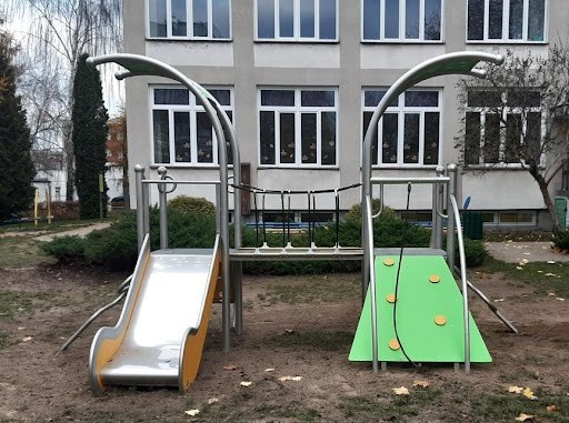 Lekställning med två torn och dubbla rutschkanor som bjuder in till fartfylld och fantasirik lek. En tålig och färgstark lösning för små barns lekplatser.