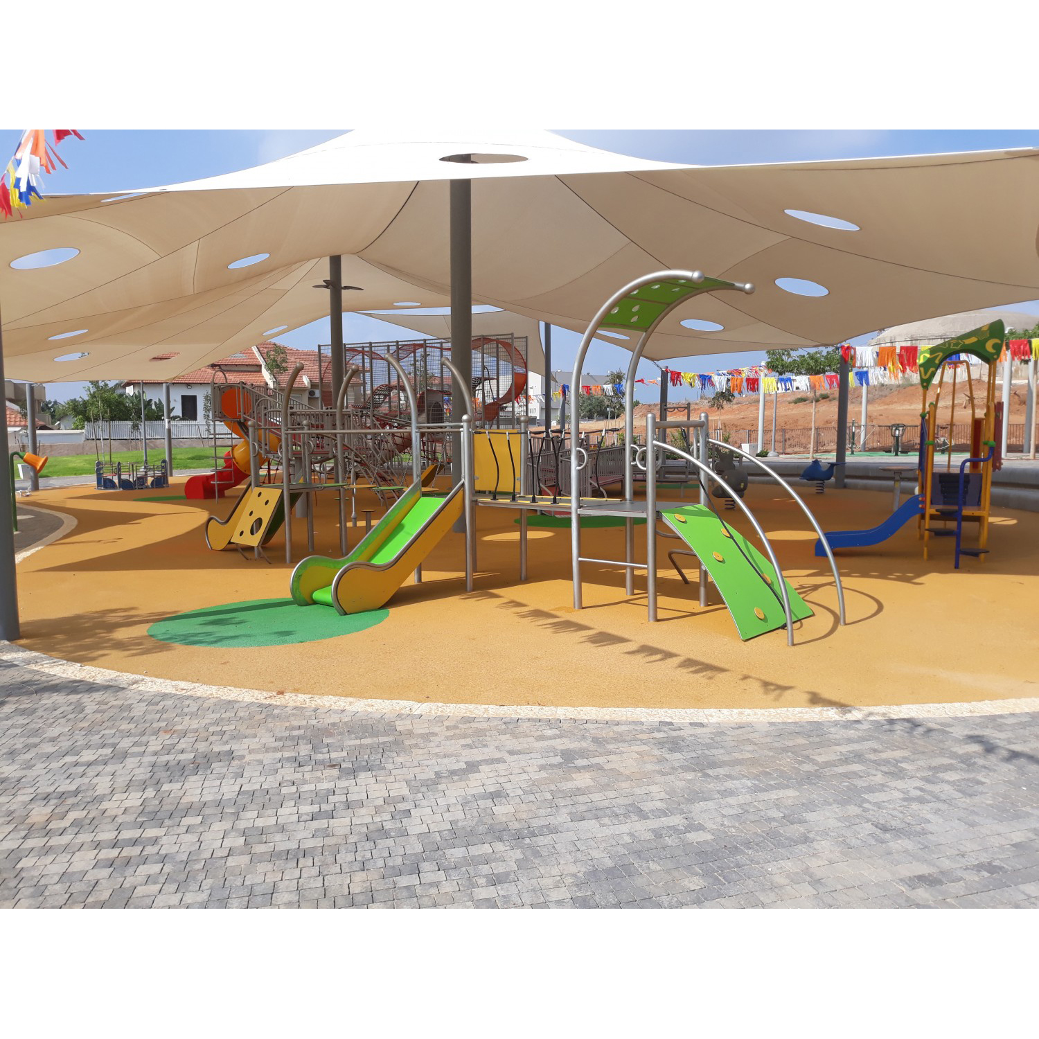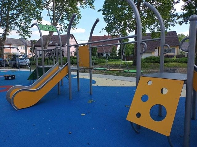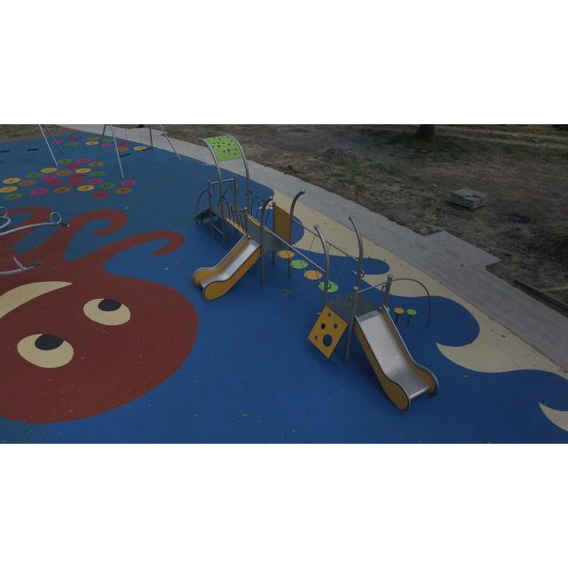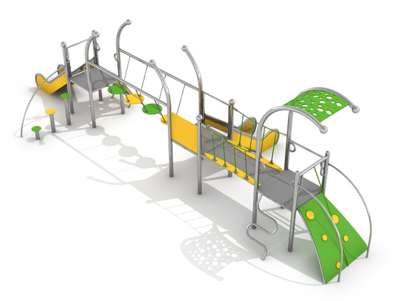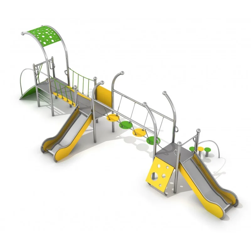 Färgglad lekutrustning med tre torn och rutschkana. Konstruktionen är svetsad i rostfritt stål utan klämmor och mycket väderbeständig. Stolparna avslutas med sfäriska dekorativa element. Rutschväggar, tak och entrégångar är tillverkade av HDPE-skiva. Golvet består av halkskyddad HPL-panel som inte värms upp i solen eller fryser vintertid. Uppfyller EN 1176. Finns även i galvaniserad och pulverlackerad version.