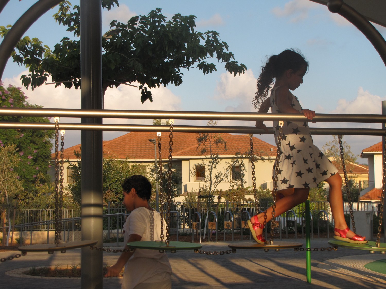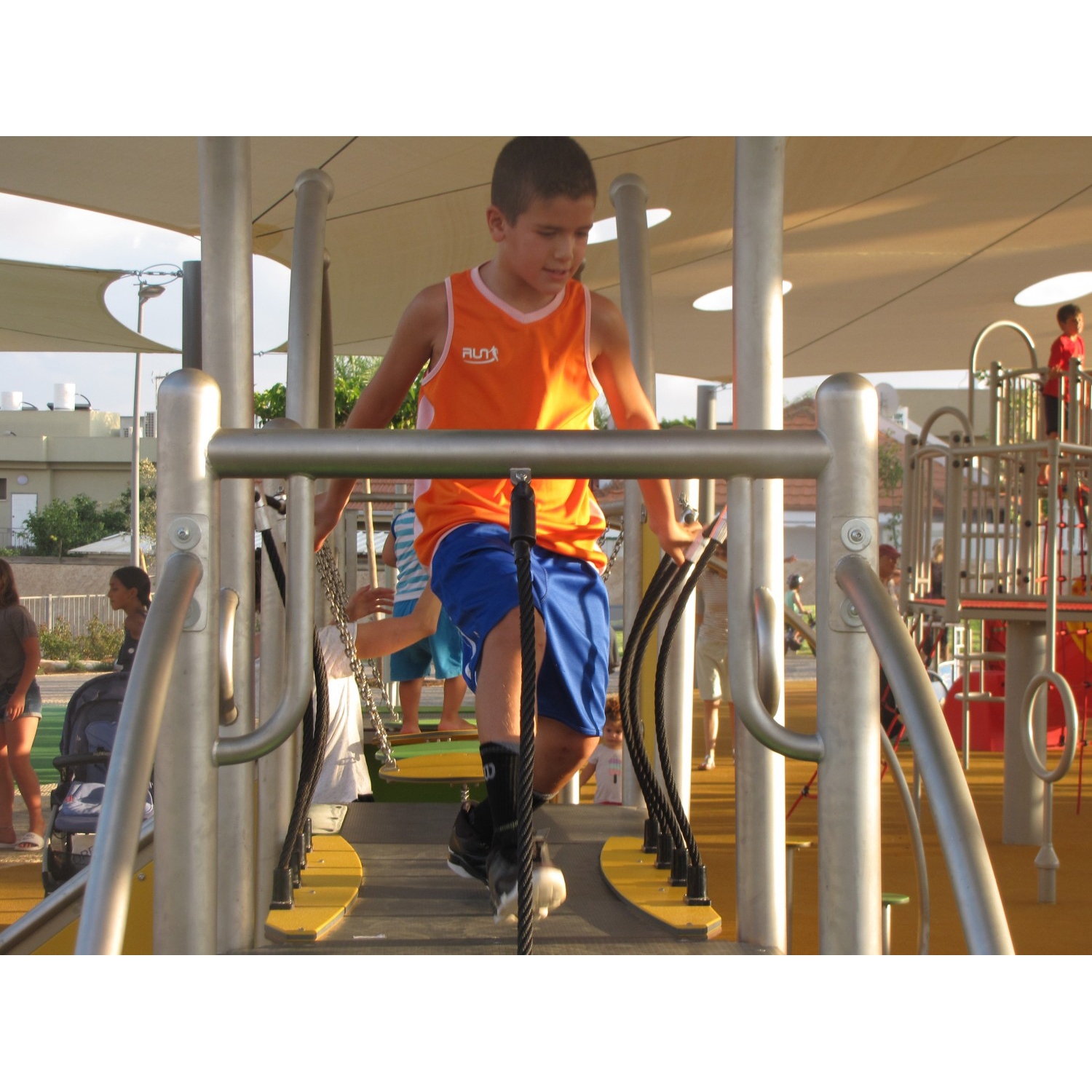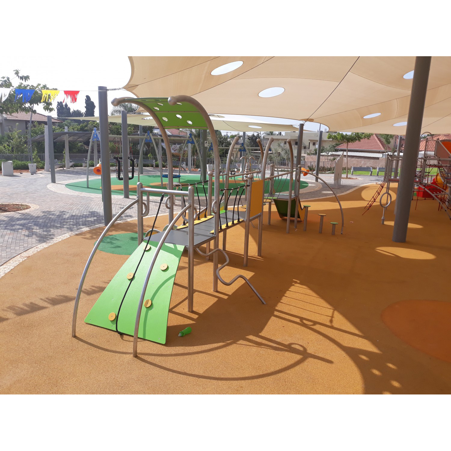 Färgglad lekutrustning med tre torn och rutschkana. Konstruktionen är svetsad i rostfritt stål utan klämmor och mycket väderbeständig. Stolparna avslutas med sfäriska dekorativa element. Rutschväggar, tak och entrégångar är tillverkade av HDPE-skiva. Golvet består av halkskyddad HPL-panel som inte värms upp i solen eller fryser vintertid. Uppfyller EN 1176. Finns även i galvaniserad och pulverlackerad version.
