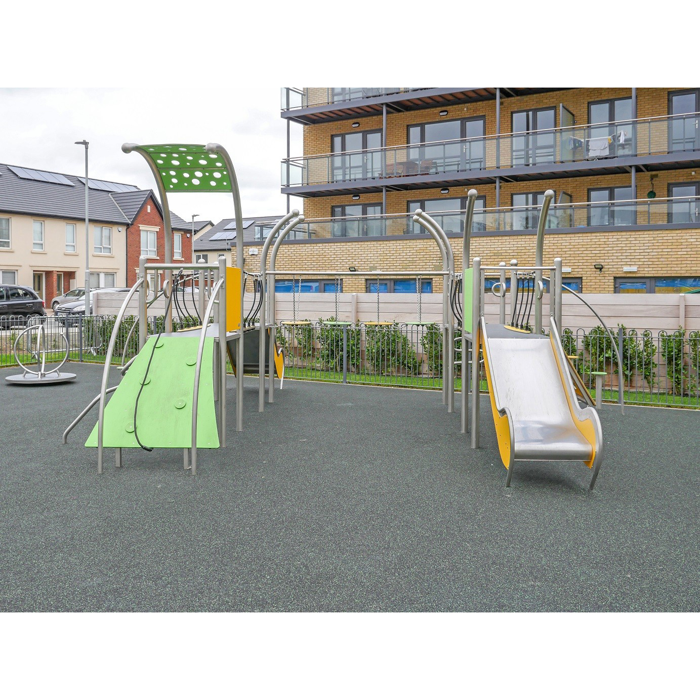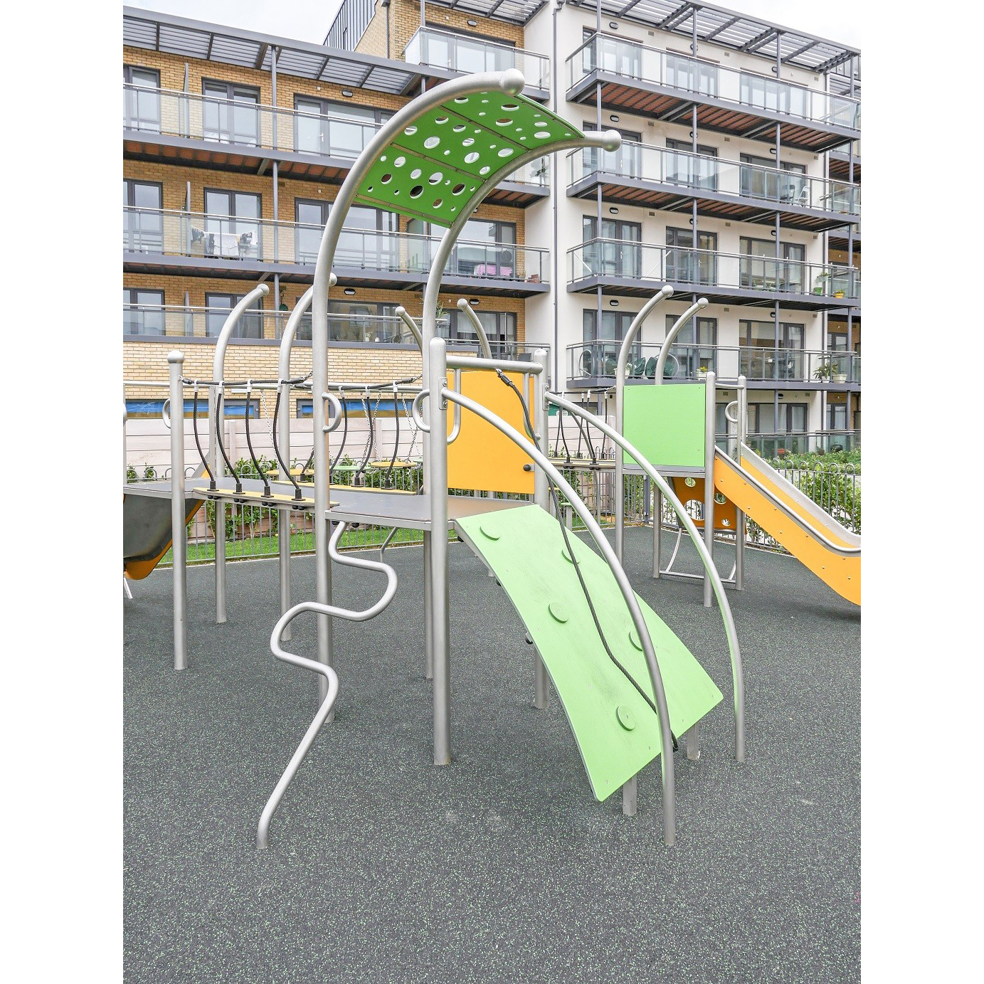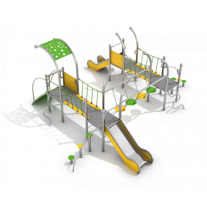 Färgglad lekutrustning med fyra torn, två raka rutschkanor, tre broar inklusive rörlig bro upphängd i kedjor samt entréstegar. Konstruktionen är svetsad i rostfritt stål utan klämmor och avslutas med sfäriska dekorativa element. Väggar, tak och entrégångar är tillverkade av HDPE-skiva. Golvet består av halkskyddad HPL-panel för säker användning året runt. Uppfyller EN 1176. Finns även i galvaniserad och pulverlackerad version.