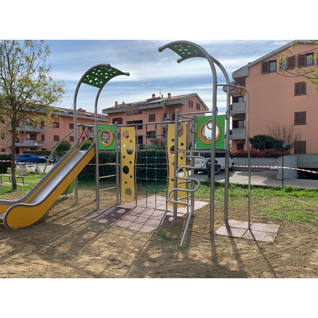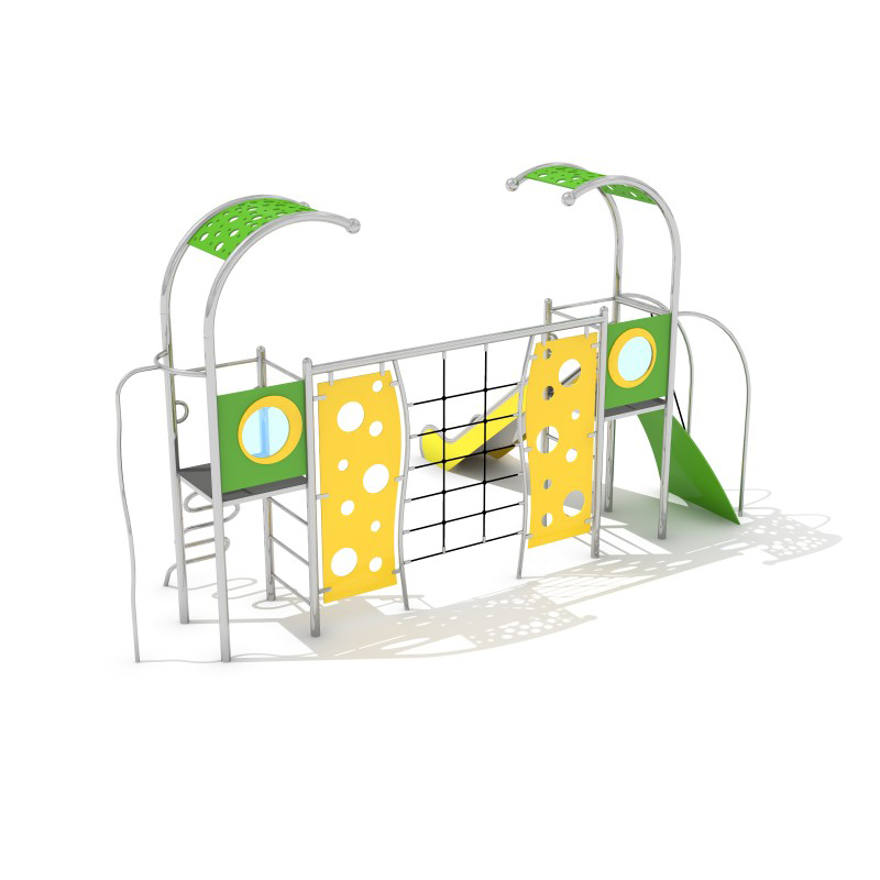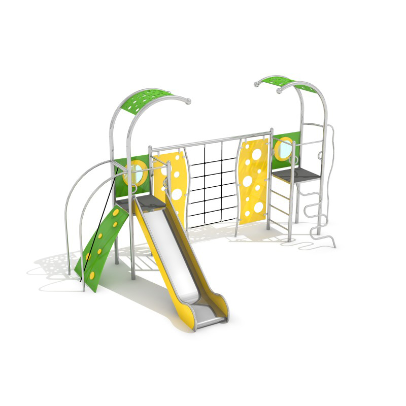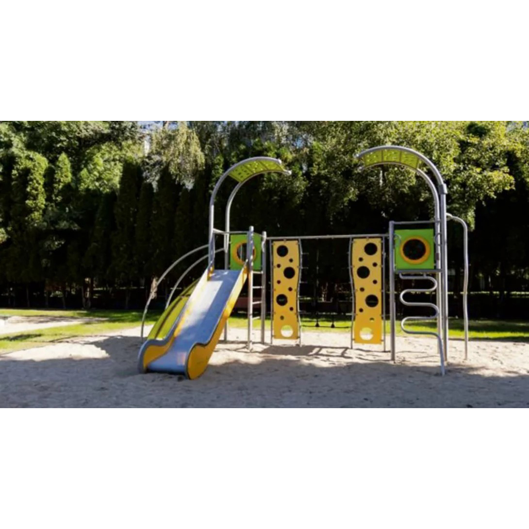 Lekutrustning med rutschkana och torn i svetsad rostfri stålkonstruktion utan klämmor. Stolparna avslutas med sfäriska dekorativa element som snigelhorn. Rutschkanor, torn och räcken är tillverkade av slitstark HDPE. Golvet består av halkskyddad HPL-panel som minimerar temperaturpåverkan. Uppfyller EN 1176. Finns även i galvaniserad och pulverlackerad version.