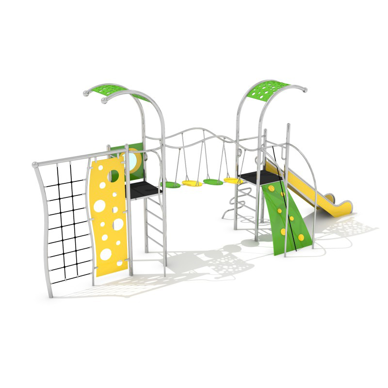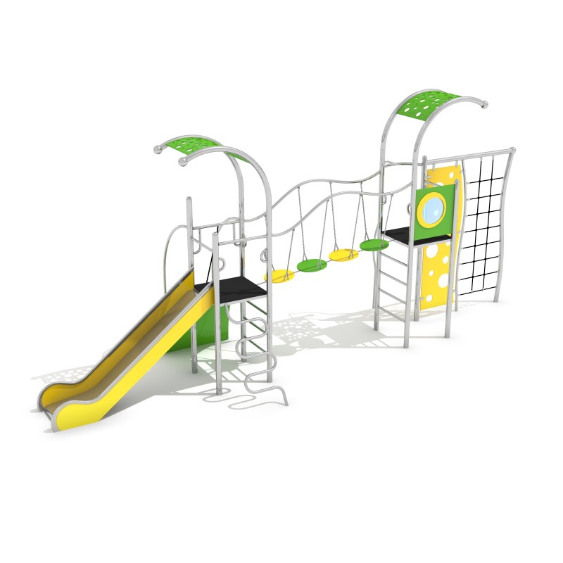 Lekställning med två torn i rostfritt stål med rutschkana och dekorativa kulavslut. Golvet är tillverkat av halkfri HPL som inte värms upp i solen och inte fryser vintertid. Konstruktionen är väderbeständig och avsedd för långvarig användning. Finns även i galvaniserad och pulverlackerad version.