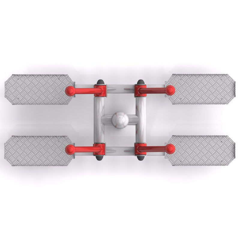 Dubbel skid-löpare för utegym som tränar både över- och underkropp. Utrustningen förbättrar kondition, hjärt- och lungfunktion samt motorisk koordination. Användaren placerar fötterna på fotplattorna och greppar handtagen, rör benen som vid längdskidåkning och håller ryggen upprätt.