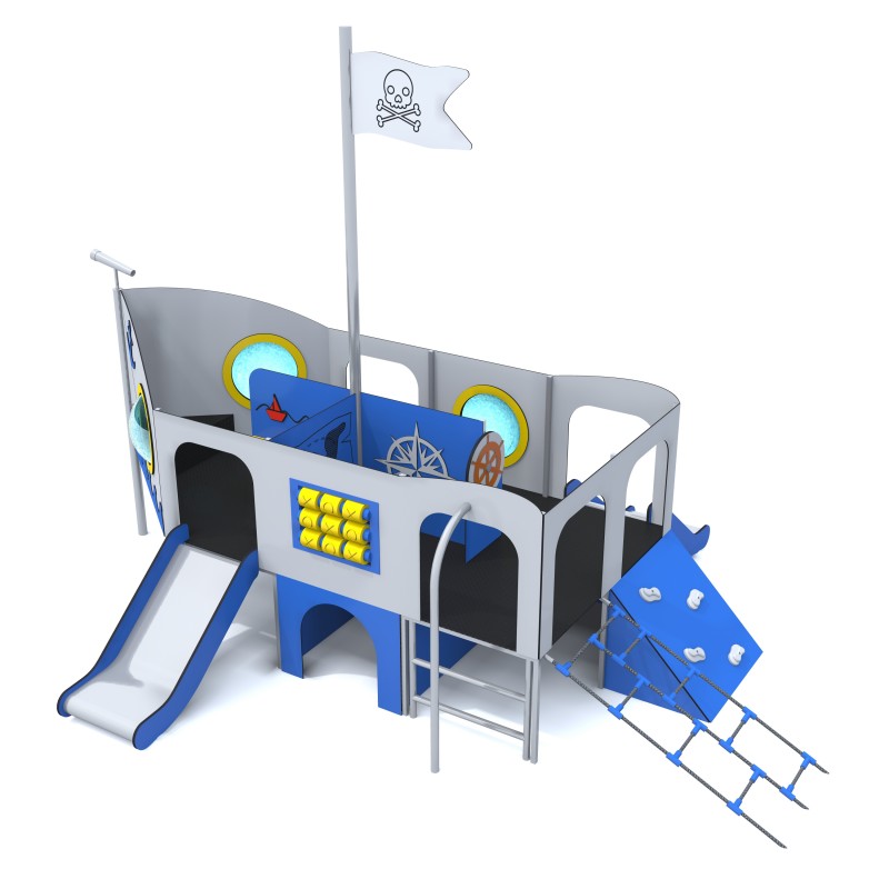 Lekplats som ser ut som ett stort skepp. Stommen är tillverkad av galvaniserat och pulverlackerat stål. De strukturella väggarna är av HPL-skiva med dekorativa HDPE-element. Plattformen är gjord av halksäker HPL-skiva.
