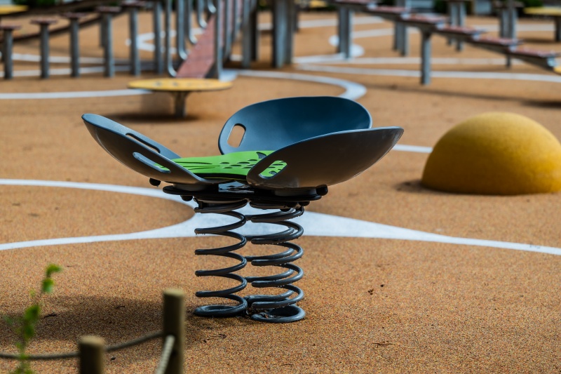 Tresitsig fjädergunga för gemensam och rytmisk lek.