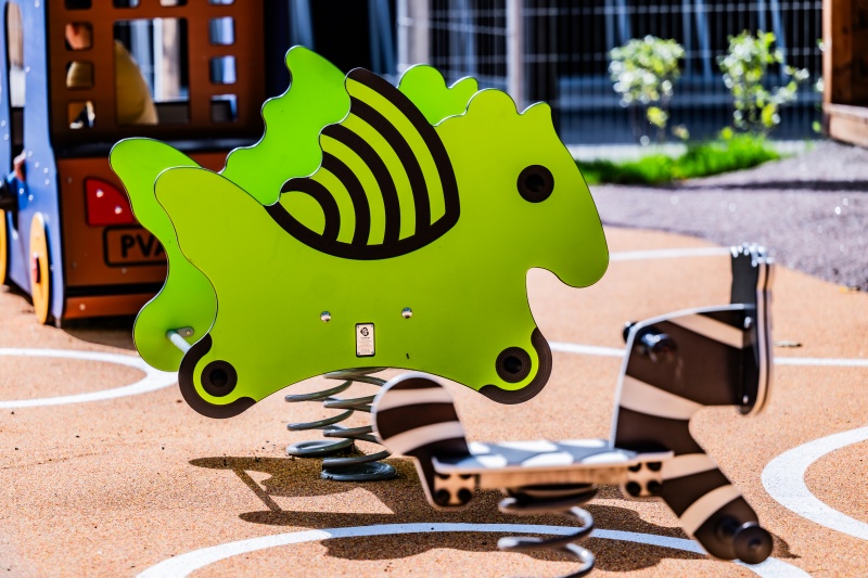 Pegasus är en fjädergunga som låter två barn gunga tillsammans. Den gemensamma rörelsen tränar balans, samspel och koordination, medan handtag och benstöd ger stabilitet.
